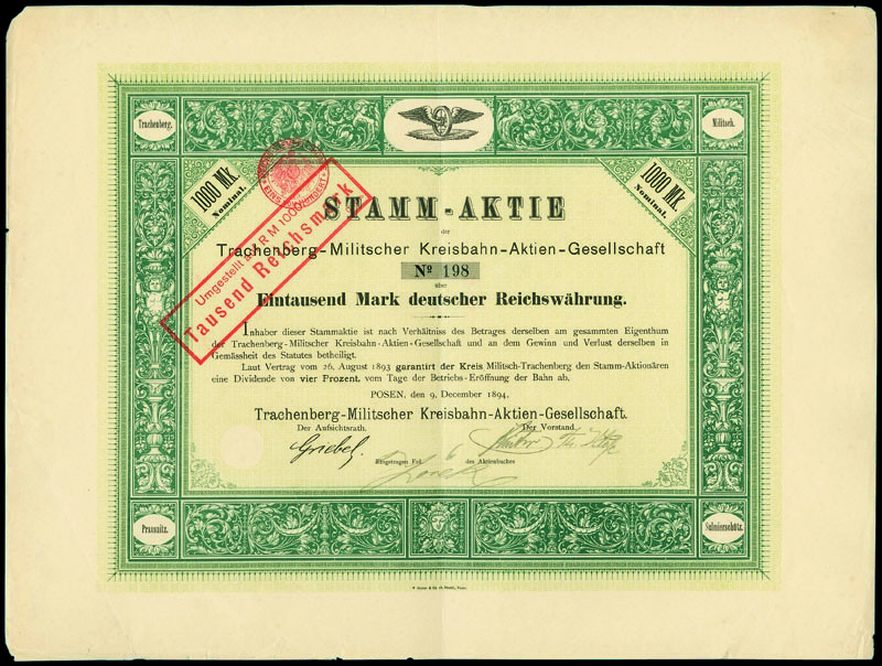 Trachenberg-Militscher Kreisbahn-AG. Aktie über 1.000 Mark. Posen, 9. Dezember 1894. Grün. Nr. 198. Unentwertete Gründeraktie dieser Gesellschaft, welche diese 59 km lange Schmalspurstrecke von Trachenberg über Militsch nach Sulmierschütz mit Abzweigung von Przittkowitz nach Prausnitz baute und betrieb. Es wurden 700 Aktien zu je RM 1.000 begeben. EF.