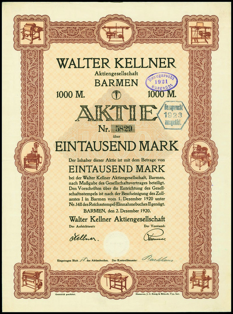 Walter Kellner AG. Aktie über 1.000 Mark. Barmen, 2. Dezember 1920. Braun. Nr. 5829. Die Gesellschaft wurde kurz nach Kriegsende 1919 gegründet. Zweck war der Betrieb einer Maschinenfabrik mit Ankauf, Verkauf und Herstellung von Maschinen aller Art. Fünf Jahre nach Ausgabe der Aktie wurde über die Gesellschaft der Konkurs eröffnet. Faksimileunterschrift Kellner. Acht Abbildungen diverser Textilmaschinen. VF.