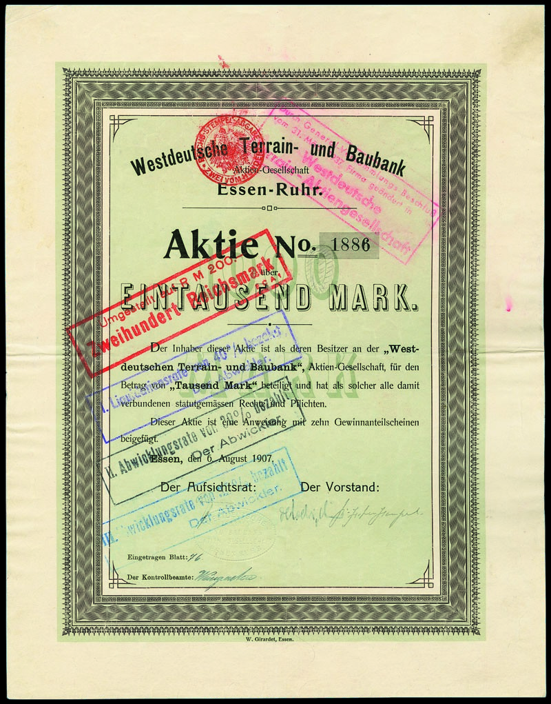 Westdeutsche Terrain- und Baubank AG. Aktie über 1.000 Mark. Essen, 6. August 1907. Grün. Nr. 1886. Die Gesellschaft wurde 1905 als “Westdeutsche Terrain-Aktiengesellschaft” zur Verwertung und Verwaltung von vorzugsweise im rheinischen-westfälischen Industriebezirk belegenen Grundstücken. Es wurden 3.000 Aktien zu je M 1.000 begeben. 1907 wurde das Unternehmen eine Bank und erhielt den Namen “Westdeutsche Terrain- und Baubank AG”. 1925 erfolgte die Kapitalumstellung im Verhältnis 5:1. Die 3.000 Aktien hatten nun einen Nennwert von je RM 200. 1936 wurden aufgrund des Umwandlungsgesetzes die bisherigen Tochtergesellschaften “Essener Dampfziegelwerke GmbH.” und die “Auricher Tonwerke GmbH.” unter Übernahme der Gesellschaftsvermögen aufgelöst, 1937 erfolgte dann wieder die Umfirmierung in die Gründungbezeichnung. Im Jahre 1941 beschloss die GV die Auflösung der Gesellschaft, die sich bereits seit längerem in stiller Liquidation befand. Die zu erwartende Abwicklungsquote sollte sich auf etwa 145% einstellen. Ungelocht. VF.