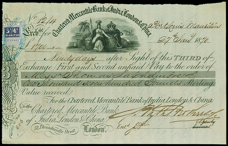 Chartered Mercantile Bank of India, London & China. Wechsel über £1.700 (Eintausendsiebenhundert). Ausgestellt in Port Louis Mauritius am 27. Januar 1870. Nr. 12/4. Kleinformatiger Titel mit grosser Vignette. Violette Stempelmarke von Mauritius. EF.