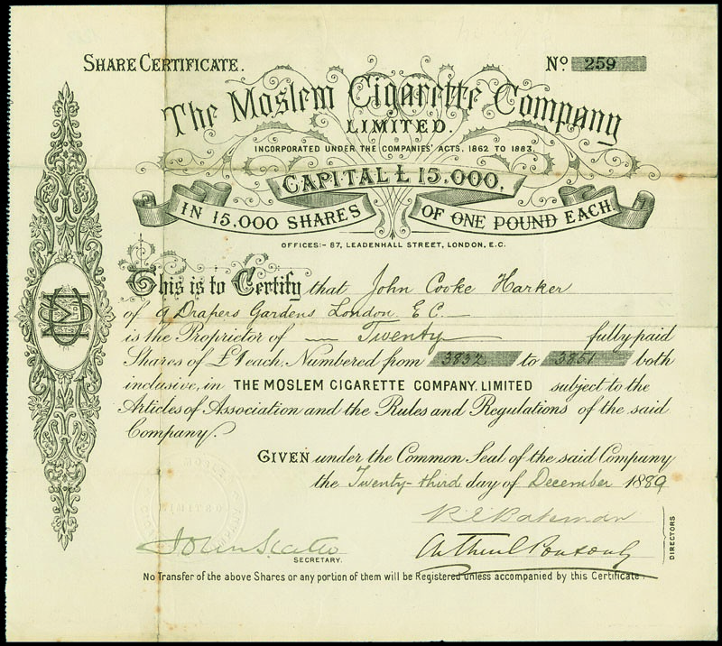 Moslem Cigarette Company. Zertifikat über 20 Shares. 23. Dezember 1889. Nr. 259. Frühe Zigarettengesellschaft. VF.
