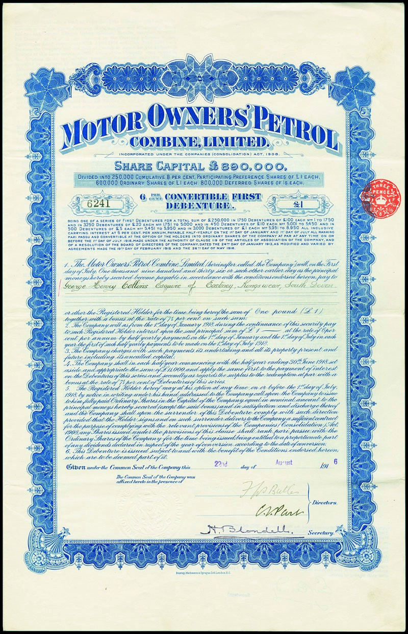 Motor Owners' Petrol Combine. Convertible First Bond über £1. 22. August 1916. Blau. Nr. 6241. VF.