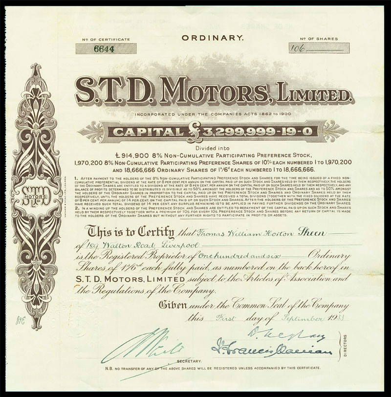 S.T.D. Motors Limited. Zertifikat über 106 Shares. 1. September 1933. Braun. Nr. 6644. Das Unternehmen, kurz Standard, wurde in Coventry gegründet. 1912 beteiligten sich Bettman und Band, die Gründer der Triumph Motor Company, an der Gesellschaft. 1914 ging Standard an die Börse. Das Unternehmen wurde 1960 von der Leyland Motors Limited übernommen. Der letzte Standard wurde 1963 hergestellt. VF.