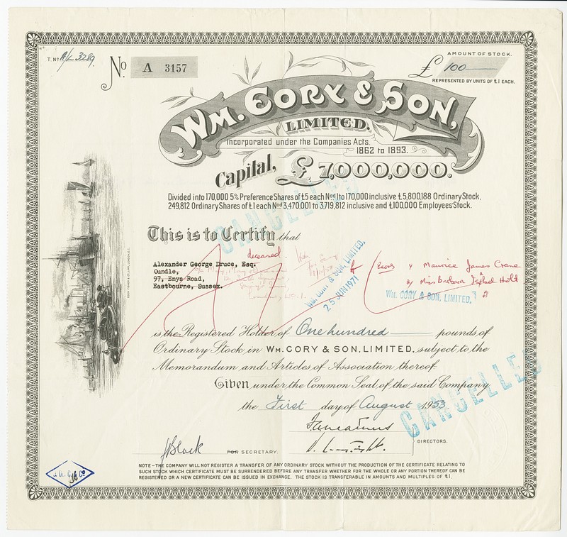 Wm. Cory & Son Limited. Zertifikat über 100 Shares. 1. August 1953. Nr. 3157. Dekorativ mit Abbildung Hafenszene. VF.