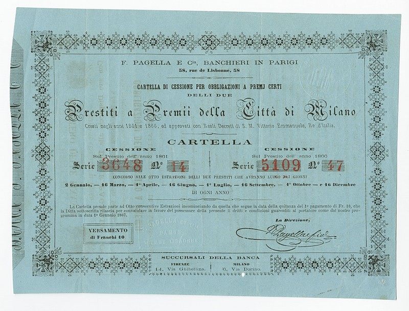 Città di Milano / F. Pagella e Cia. Paris. Cartella di Cessione on two Bonds of the City, F 10, Paris, 1867. Nr. 3648/14 and 5109/47. Issued by this Italian bank in Paris (with branches in Firenze and Milano) on two bonds of the city of Milano from 1861 and 1866. EF.