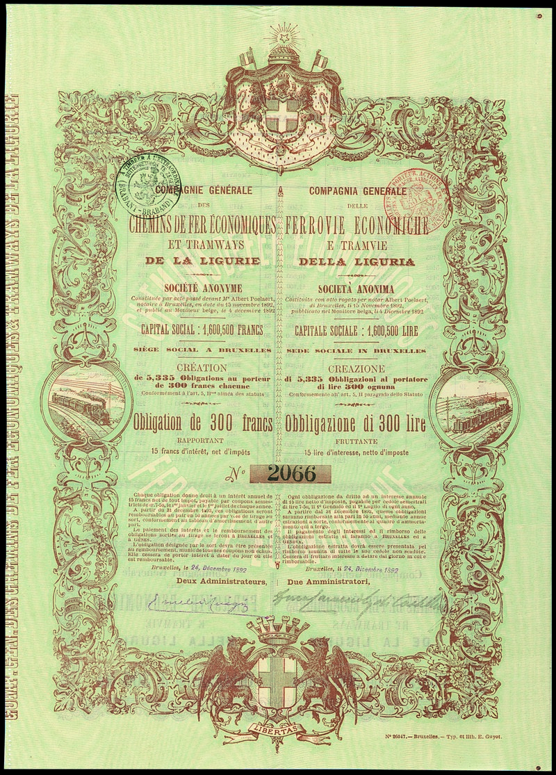 Ferrovie Economiche e Tramvie della Liguria. Bond 300 L, Bruxelles, 24. December 1892. Nr. 2066. EF.