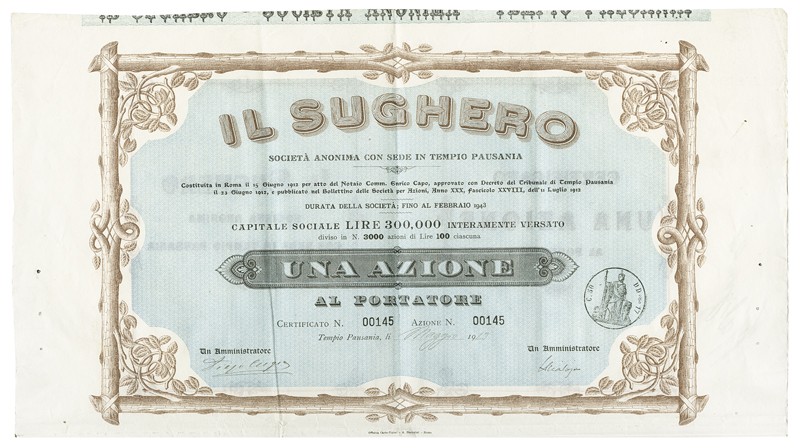 Il Sughero. Una azione di L 100, Tempio Pausania, 1 March 1919. Nr. 00145. Cork producer from Sardinia. Pretty frame with cork oak trees. VF.
