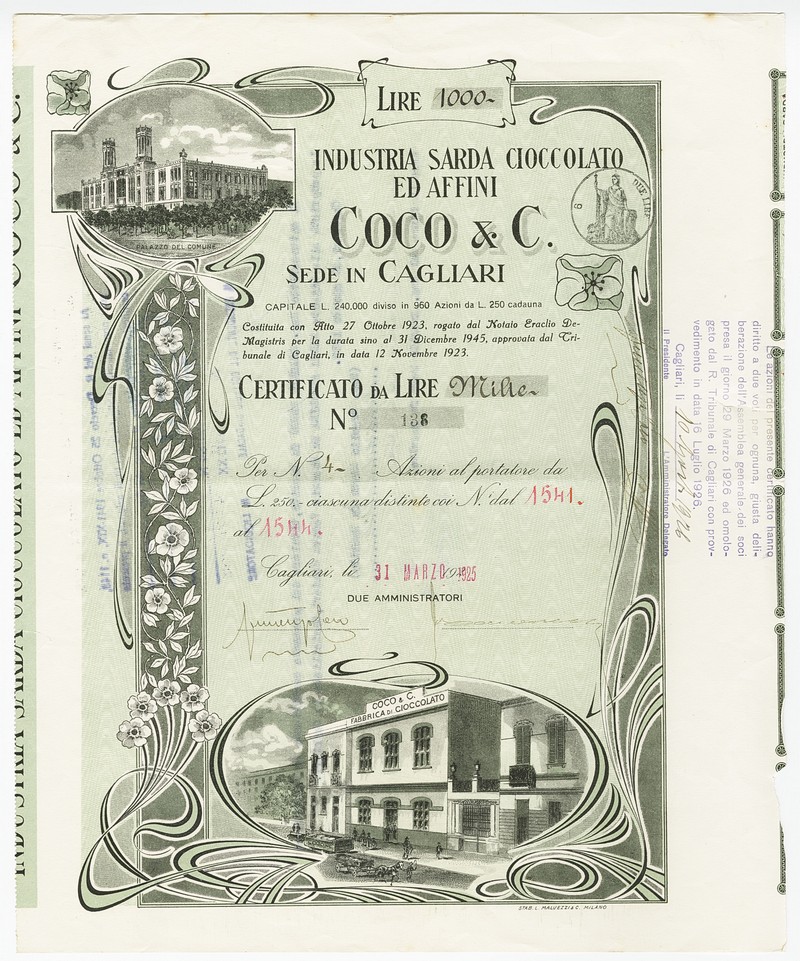 Industria Sarda Cioccolato ed Affini Coco & Co. Certificate 4 share 250 L each, Cagliari, 31. March 1925. Nr. 136. Decorative frame with illustrations of the production site. The Company was founded 1923 with a capital of L 240.000 divided in 960 share at L 250 each. Small tears. VF.