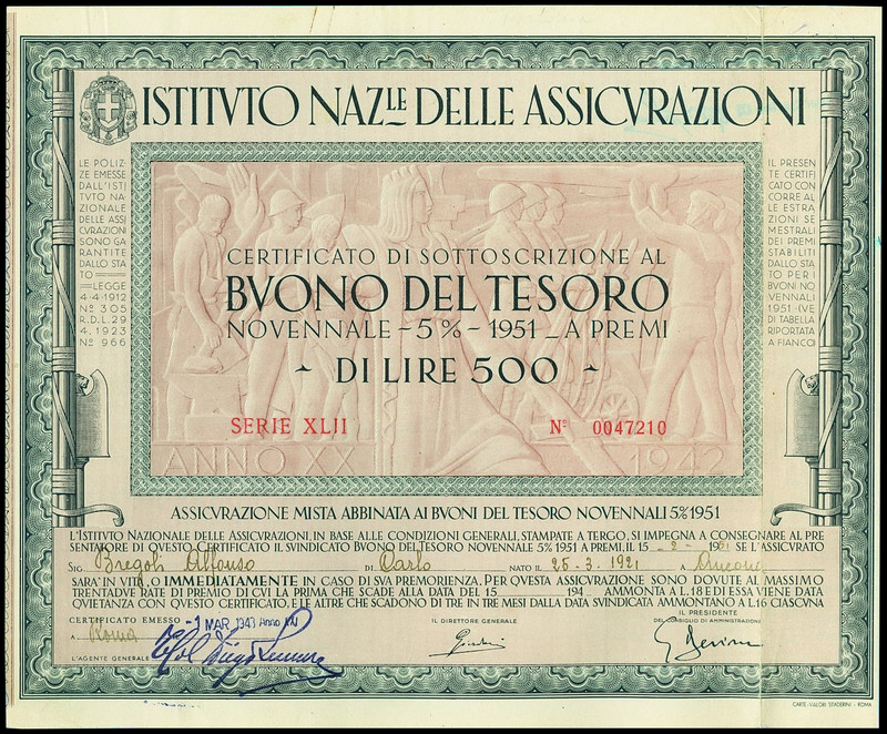 Istituto Nazionale delle Assicurazioni. Buono de Tesoro 500 L, Rome, 1.March 1943. Nr. 47210. VF.