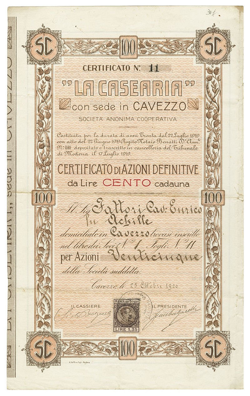La "Casearia" con sede in Cavezzo. Azione 25 da 100 L., Cavezzo (MO), 25 Ottobre 1920. Nr. 11. A cheese producer from Cavezzo near Modena. Ink semears. EF.