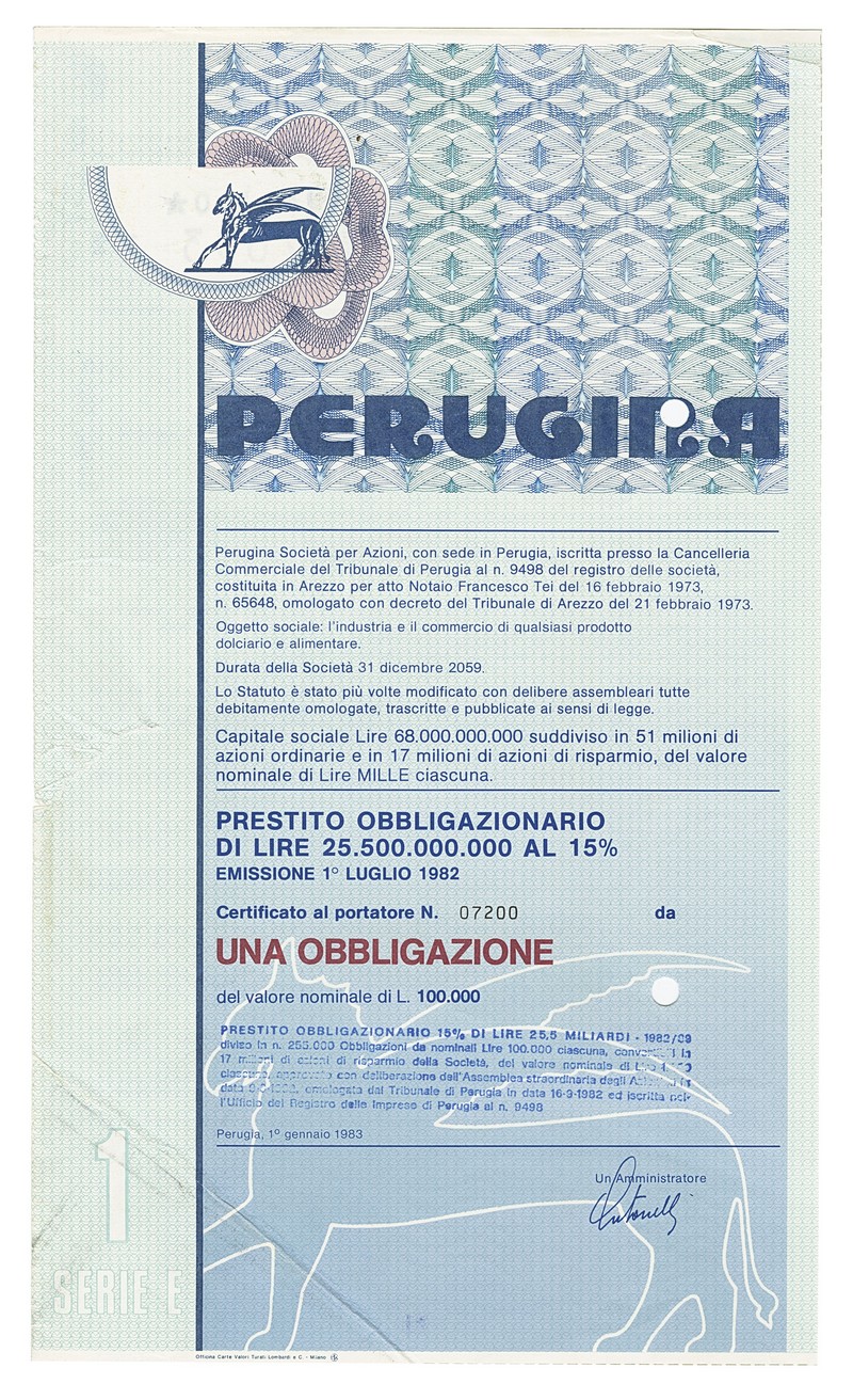 Perugina. Prestito obbligazionario al 15%, 1 Obbligazione 100.000 L., Perugia, 1 Gennaio 1983. Nr. 07200. The confectionery Company Perugina, based in Perugia, was formed in 1907 by Giovanni Buitoni and Luisa Spagnoli. It’s most famous products are the "Baci", chocolate "kisses" wrapped in a love note. Since 1988, Perugina is a part of Nestlé SA. Tears and punch holes. VF.
