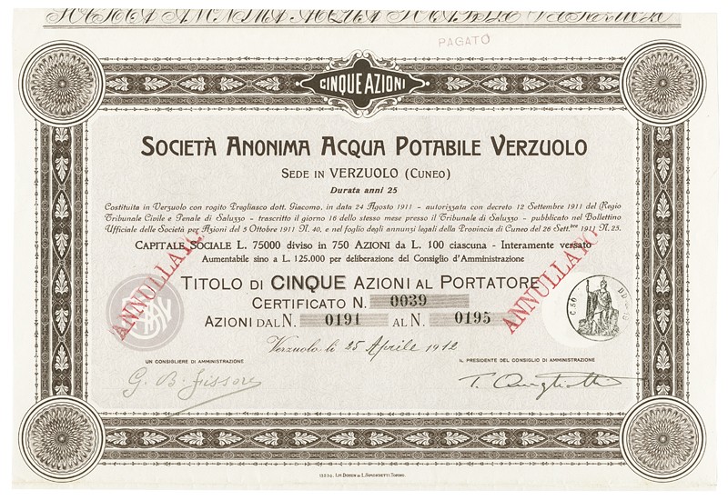 S. A. Acqua Potabile Verzuolo. Azione 5 da 100 L., Verzuolo (Cuneo), 25 Aprile 1912. Nr. 0191-95/750. EF.
