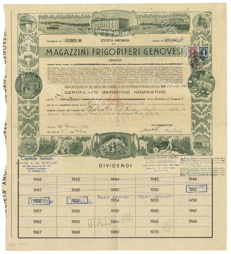 SA dei Magazzini Frigoriferi Genovesi. Azione 11 da 250 L., Genova , 22. Gennaio 1952. Nr. 1202 A. This share brings back the nearly forgotten history of man-made cold and frozen food. In Italy it was Fausto Scerno a merchant from Genova, who was the pioneer for introducing this so important refrigeration industry. In 1902, he founded the Magazzini Frigoriferi Genovesi SA to build the first cold store with 3’600m3 storage room in the harbor of Genova. Scerno also planned for a nationwide expansion of the refrigeration industry through the implementation of a network of refrigeration equipment in Italian ports. Thanks to his idea ships started to be equipped with refrigerated holds and began construction of steamships refrigerator. But Scerno not only rented out cold stores, he also hired two butcher for setting up sales of frozen meat in the city and in 1905, he bought the first car refrigerator. However success was very slow. It was long after Scerno’s retirement that this industry started to be this big success story. Beautiful share of the Company with illustrations of the cold industry. In the middle a picture of the cold store in Genova. VF.