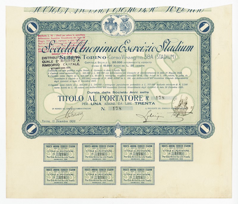 SA Esercizio Stadium. Azione 1 da 30 L., Torino, 15 Dicembre 1926. Nr. 178. EF.