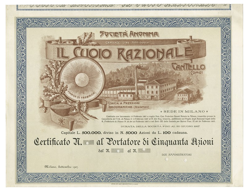 SA Il Cuoio Nazionale. Azione 50 da 100 L., Milano, Settembre 1907. Unissued. Decorative share of this producer of lether straps from Cantello, Como. EF.