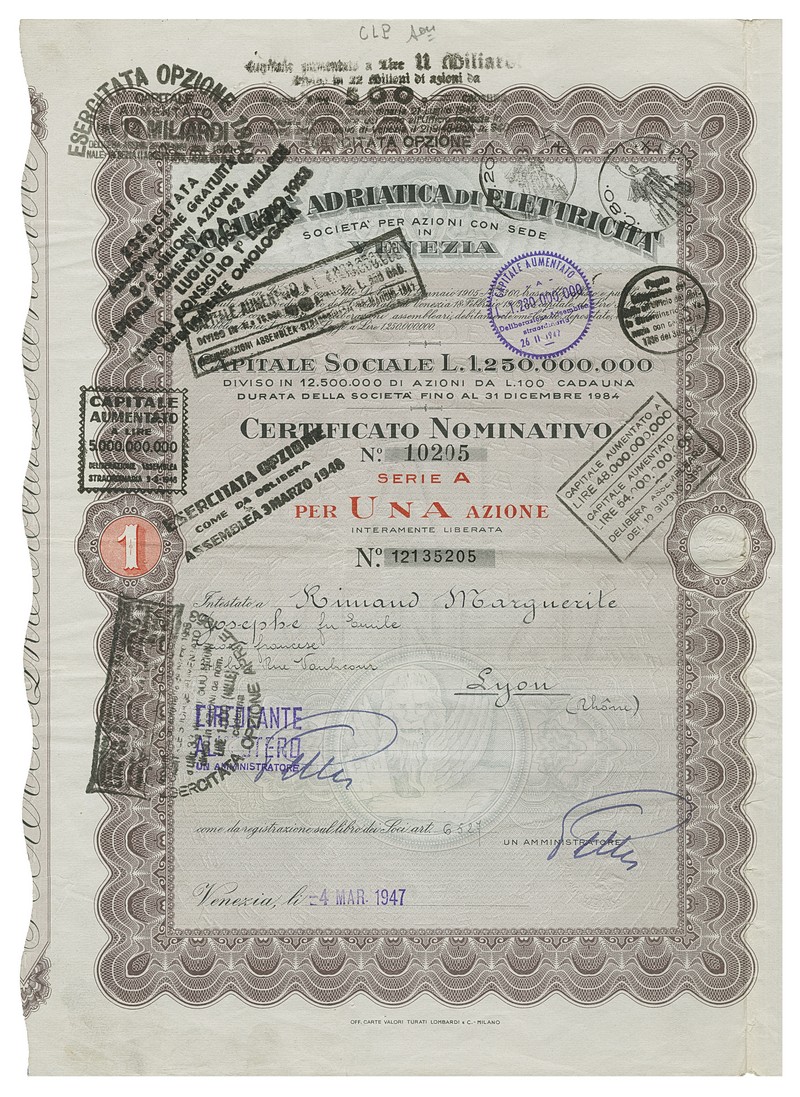 Società Adriatica di Elettricità. Azione 1 da 100 L., Venezia, 4 March 1947. Nr. 10205/12135205. Founded in 1905, in Venice, by Giuseppe Volpi, the Company was a important manufacture of “installations for the generation, transmission and distribution of electricity in Italy and abroad”. Volpi was its president for 30 years. The Company played an important role in the industrialization of Veneto. In 1962 the Company was nationalized, becoming a part of ENEL. Many stamps showing different increases of the Company’s capital. Many small holes mainly from pins. VF.