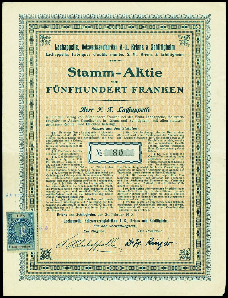 Lachappelle, Holzwerkzeugfabriken AG. Stamm-Aktie über 500 Franken. Kriens und Schiltigheim, 24. Februar 1910. Olivbraun/blau. Nr. 80. Interessantes Papier mit sehr kleiner Auflage von 270 Stück. Abbildung einer Kapelle auf der Vorderseite. Im Jahre 2000 wurde die Produktion eingestellt. Heute noch bestehende Gesellschaft. EF.