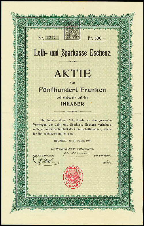 Leih- und Sparkasse Eschenz. Aktie über 500 Franken. Eschenz, 25. Oktober 1907. Blaugrün. Nr. 1217. Die Bank wurde 1865 gegründet und wies im Jahre 1883 ein Aktienkapital von 200.000 Franken aus. 1920 musste um Nachlassstundung nachgesucht werden und 1924 erfolgte die Liquidation. Hochformatiger, mit Wappen verzierter Wert. EF.