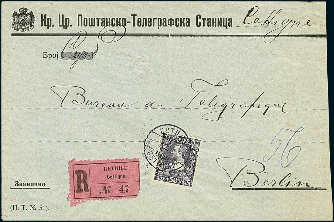 Telegrams, Telegraph & Telephone Stamps - The Professor Shaul Ladany Collection, Part IIMontenegro1912. Two registered envelopes for telegrams, addressed from Cettigne to the telegraphic postal office at Berlin, both carried at 50 para rate, with different frankings exhibiting the 1910 Nicholas I 25pa. & 50pa. denominations. Minor wrinkles or filing fold. A scarce duo. Yvert 94, 96. Photo