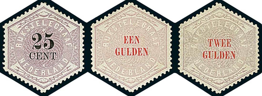 Telegrams, Telegraph & Telephone Stamps - The Professor Shaul Ladany Collection, Part IINetherlandsTelegraph Stamps1877-1903, 1c. to 2g., complete set of 12 mint values, well centred for the most part, very fresh; as well as unused 5c. and 60c. (the latter creased) with punched hole, and 50c. pair punched and cancelled with blue crayon. The 12½c. and 60c. with small thin spot, of little significance, with the most valuable denominations being sound and very fine (scarcer thus). A very difficult and rare set. NVPH TG1-TG12; € 6,750. Photo