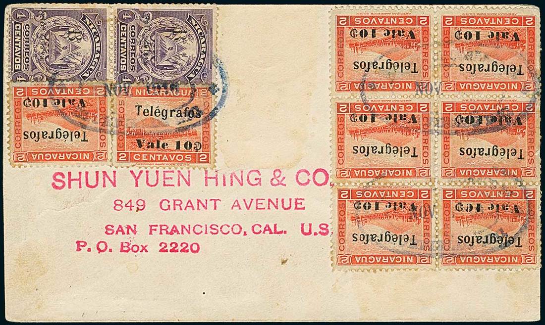 Telegrams, Telegraph & Telephone Stamps - The Professor Shaul Ladany Collection, Part IINicaragua1899-1910, an interesting group of 8 covers with telegraph stamps during periods of postage stamps shortage, all except one sent abroad, including scarce frankings. Photo