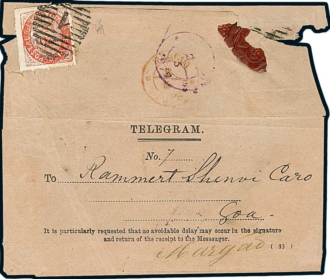 Telegrams, Telegraph & Telephone Stamps - The Professor Shaul Ladany Collection, Part IIPortuguese Colonies Portuguese India1872, May 2. Telegram envelope from Panjim to Margao, franked by 1872 20r. vermilion, Die II, perf. 12½-14½, on laid paper, tied by "1" oval of bars, with Panjim c.d.s. in red alongside, together with indistinct c.d.s. in violet. Stamp lifted for examination and hinged back to place; flap faults on back. Very rare. Opinion Holcombe. S.G. 20. Photo
