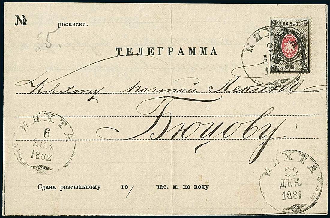 Telegrams, Telegraph & Telephone Stamps - The Professor Shaul Ladany Collection, Part IIRussian Post Offices AbroadMongolia1881, Dec. 29. Telegram folded form from St. Petersburg to Peking, initially sent to Toizkossawsk in Transbaikal, from there being forwarded to the Frontier P.O. of Kyakhta, situated on the border between Siberia and Mongolia, where the franking, with 7k. black and carmine, paying part of the 30 kopeks fee stated inside, was tied with single c.d.s. (subtype of fig. 438 in Tchilinghirian). The form was finally transmitted to Peking on 6.1.1882. A very rare and fascinating usage. Cert. Mikulski. Mi. 25. Ex Mehrtens. Photo