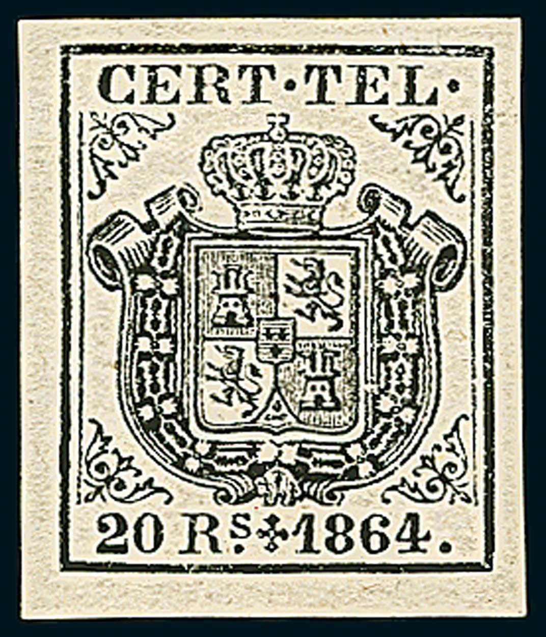 Telegrams, Telegraph & Telephone Stamps - The Professor Shaul Ladany Collection, Part IISpainTelegraph Stamps1864, 1r. brown, 4r. rose, 16r. green and 20r. black, complete set of four, with large margins and original gum mint. 4r. with tiny thin spot as a result of gum lacking. Very fresh. Edifil 1-4. Photo
