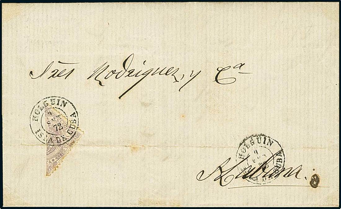 Telegrams, Telegraph & Telephone Stamps - The Professor Shaul Ladany Collection, Part IISpanish Colonies CubaTelegraph Stamps1872, 50c. mauve, diagonal half used as 25c. on 9 September 1872 entire letter to Havana, tied by "Holguin/Isla de Cuba" c.d.s., repeated at right. Although the usage of bisect regular stamps is not scarce in Cuba, the application of bisect telegraph stamps is absolutely infrequent with, to our knowledge, only two covers recorded in the classic period (both belonging to the same correspondence and bearing an identical franking and cancellation, which are also affected by the same imperfection -horizontal filing fold through adhesive-). Very desirable. Edifil 21. Photo