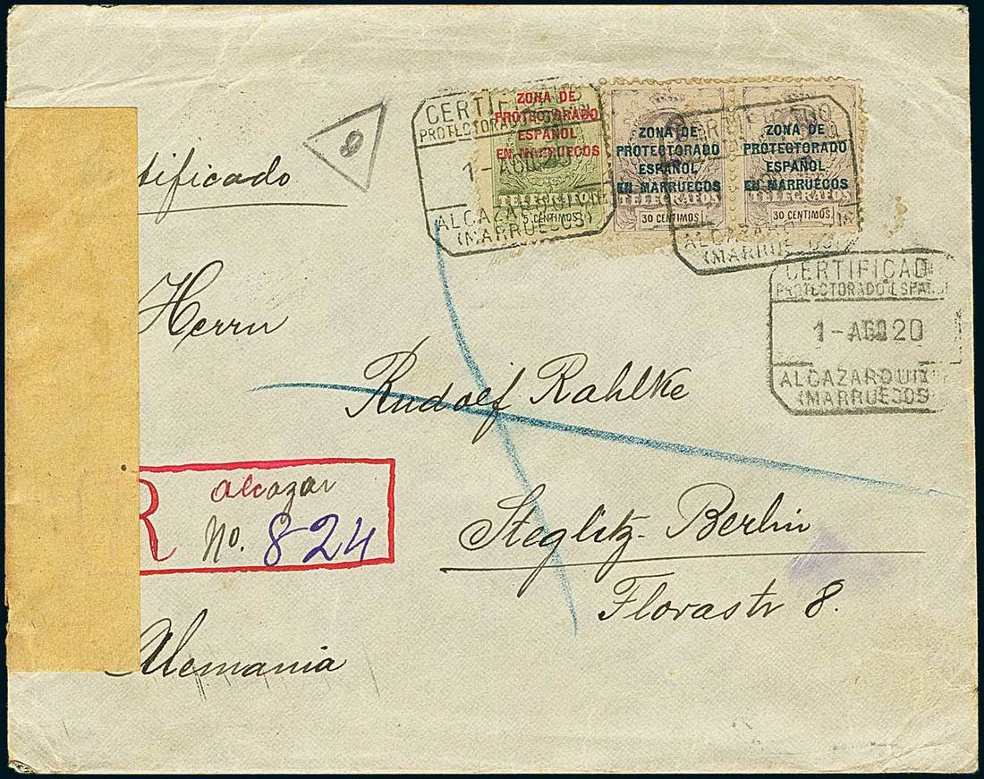 Telegrams, Telegraph & Telephone Stamps - The Professor Shaul Ladany Collection, Part IISpanish Colonies MoroccoTelegraph Stamps1920, Aug. 1st. Registered cover from Alcázar to Berlin, censored in Germany, bearing 1917-18 5c. and pair of 30c., with manuscript registration marking at left and stamps tied by corresponding datestamp on dispatch, backstamped on arrival. Rare. Edifil 9, 12. Photo