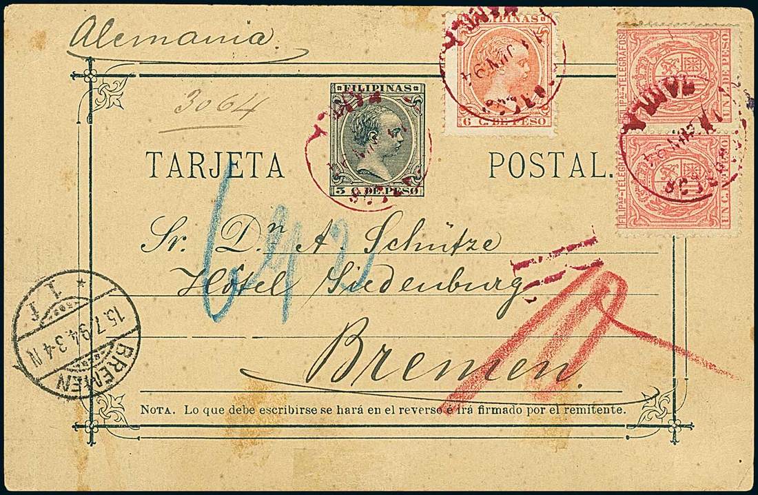 Telegrams, Telegraph & Telephone Stamps - The Professor Shaul Ladany Collection, Part IISpanish Colonies PhilippinesTelegraph Stamps1892, 1c. rose, pair tolerated instead of postage stamps on registered 1894 3c. blue postal stationery card (Edifil 9, faint vertical crease at left) to Bremen (Germany), additionally franked with regular 1894 6c. orange, tied by "Correos/18 Jun 94/Manila" c.d.s.'s in red, with arrival at left. Very scarce. Edifil 37. Photo