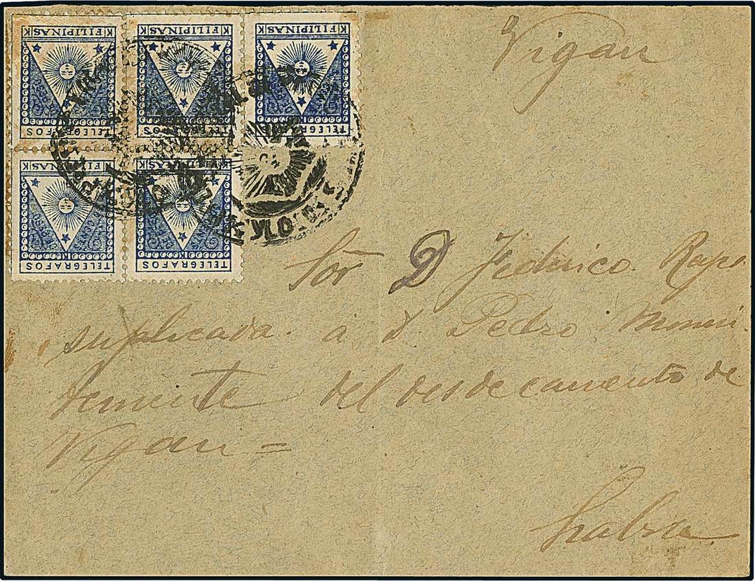 Telegrams, Telegraph & Telephone Stamps - The Professor Shaul Ladany Collection, Part IISpanish Colonies PhilippinesRevolutionary Mail1898, 50c. blue, block of five used for postage on cover (portion of back flaps missing) addressed to the lieutenant of the military detachment at Vigan, tied by illustrated oval handstamp from an indistinct locality in the region of Ilocos. Minor soiling caused by the gum of the adhesives, in no way detracting. The largest known multiple of this value used on cover. Edifil 2. Photo