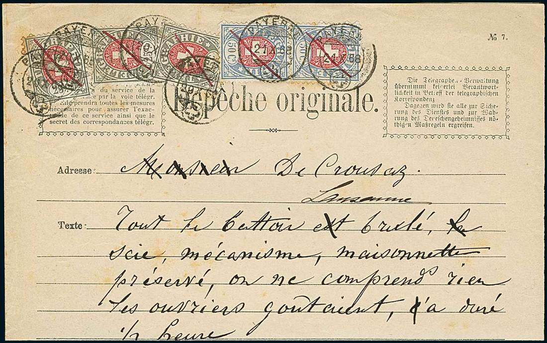 Telegrams, Telegraph & Telephone Stamps - The Professor Shaul Ladany Collection, Part IISwitzerlandTelegraph Stamps1868-74, 25c. grey and carmine and 50c. blue and carmine, three and two examples respectively, all cancelled by pen stroke and tied to complete folded telegram form to Lausanne by "Payerne 20 X 68" c.d.s. Some minor toned perforations. A very scarce and early usage. SBK 1, 2. Photo