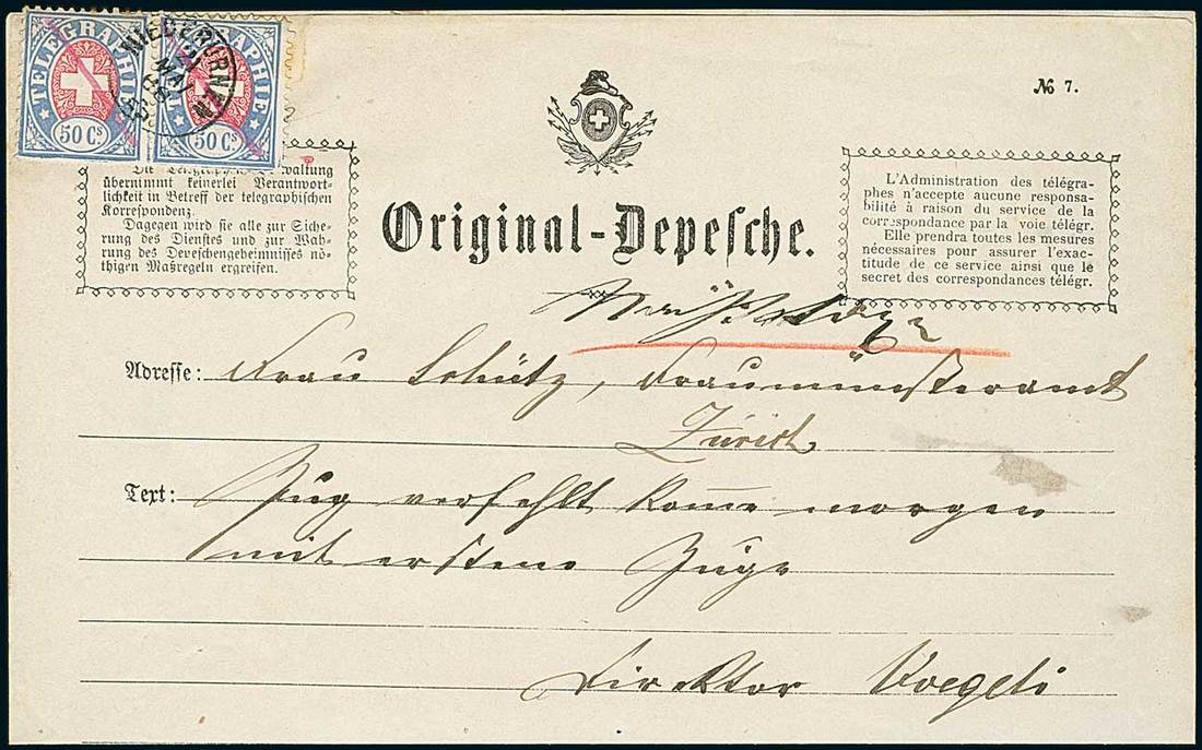 Telegrams, Telegraph & Telephone Stamps - The Professor Shaul Ladany Collection, Part IISwitzerlandTelegraph Stamps1868-74, 50c. blue and carmine, pair on complete folded telegram form to Zurich, cancelled by pen strokes and "Niederungen 21 Mai 68" c.d.s. Couple of perforations toned at top. A very scarce and early usage. SBK 2. Photo.