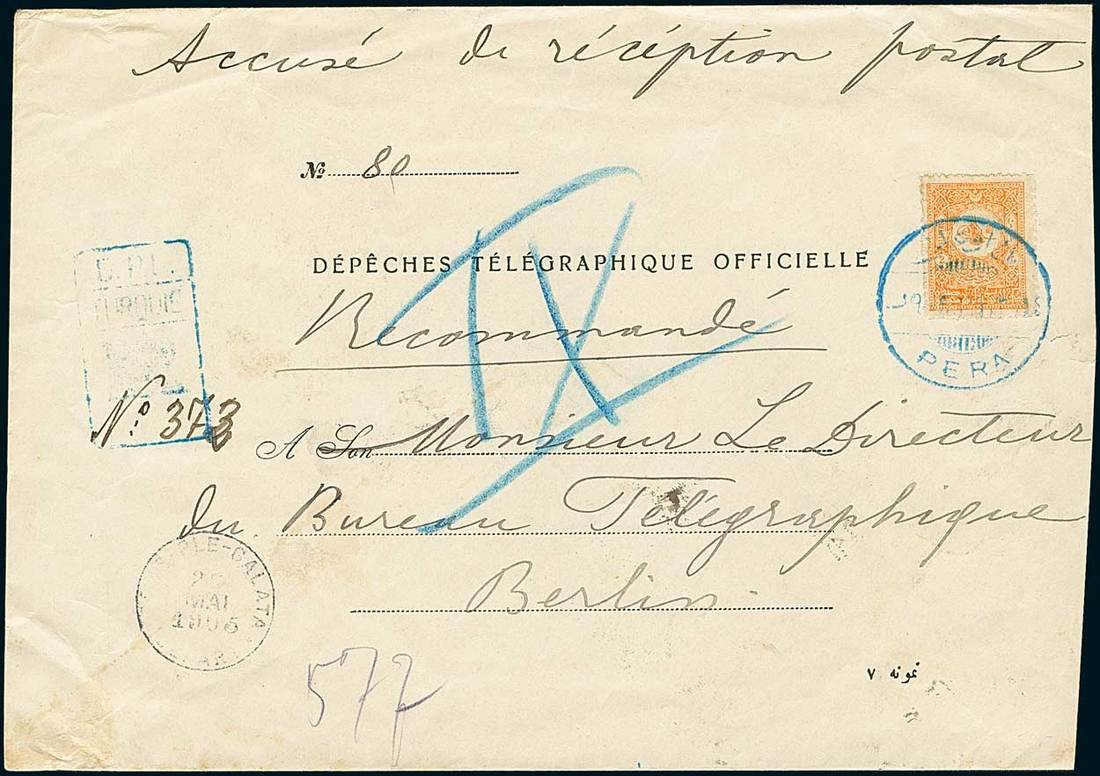 Telegrams, Telegraph & Telephone Stamps - The Professor Shaul Ladany Collection, Part IITurkeyGroup of ten items including 1905-12 four telegram covers from Pera and Therapia to Berlin, 1915 1pi. strip of ten on block of five telegram receipts used at Beirut, telegraphic negative handstamp of Galata on telegram form, 1922 "The Eastern Telegraph Company" telegram receipt, 1907-11 two franked telegram receipts of which one from Haifa. Photo