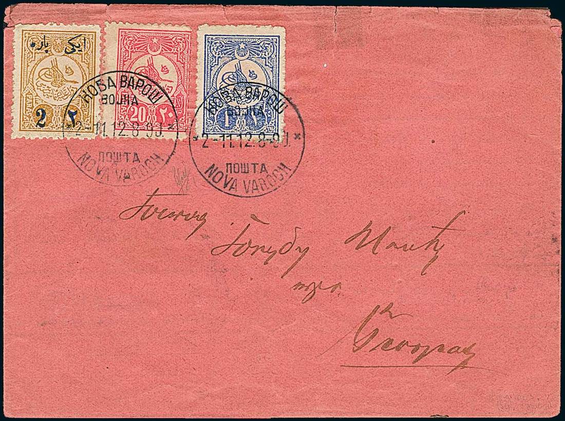 Telegrams, Telegraph & Telephone Stamps - The Professor Shaul Ladany Collection, Part IITurkey Used in Serbia1912, Nov. 2. Folded telegram to Belgrade bearing 1909-11 20pa. rose, pl. II, 1pi. ultramarine, pl. II, and newspaper stamp 1910 2pa. on 5pa. ochre, tied by bilingual "Pochta/Nova Varoch" c.d.s., with seal of the Turkish P.O. on reverse. Rare. Opinion Holcombe. Scott 153, 154, P67. Photo