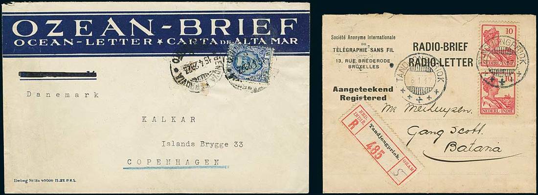 Telegrams, Telegraph & Telephone Stamps - The Professor Shaul Ladany Collection, Part IICollections and RangesOcean Telegrams. Telegrams from ships on sea were radioed to another ship of the same company that was due to arrive shortly to a harbour close to the telegram's destination; these post dispatched final stages of the telegrams, and are called "ocean letters", "radio letters", "ship letter telegrams" or "radio telegrams". 1913-48, the collection containing 50 covers (some of them with its contents)/telegram forms, bearing stamps for the great majority, including frankings from Belgium, Brazil, Chile, Denmark, Dutch Indies, France, French Morocco, Germany, Italy, Portugal, Spain and United States, with several very scarce usages. Viewing is highly recommended for this most unusual lot. Photo