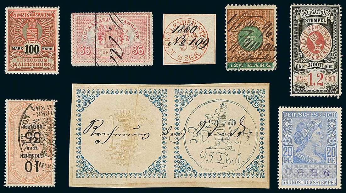 Revenue Stamps The "De Magistris" Collection, Part IIGermany1853-1960 ca., an extraordinary collection comprising over 7,500 stamps (few varieties), with States & Locals including Baden, Bavaria with proofs, Bremen, Brunswick, Hamburg, Hessen-Cassel with rare examples, Lubeck, Meckelnburg-Schwerin, Oldenburg, Prussia with few better inflation values, Saxony with scarce later locals, Württemberg; Empire with early issues, Inflation, Nazi period, Municipals & Locals including some after WWII, Tobacco strips, Eastern Africa, WWI Occupations, Plebiscites with Upper Silesia, Danzig, Memel, Saar including I & II periods and locals. A comprehensive, interesting and very seldom seen lot. Viewing highly recommended. Photo