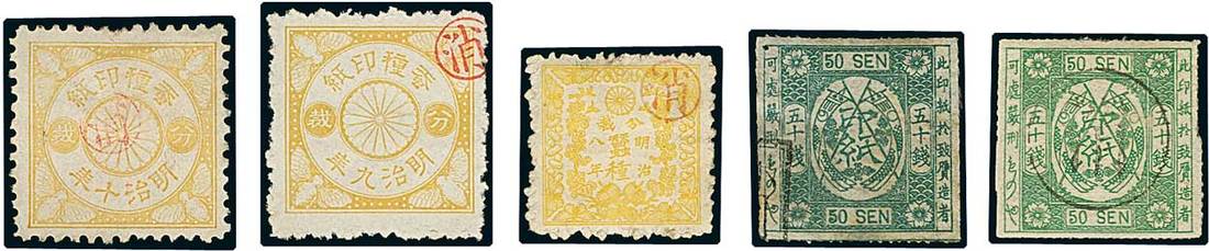 Revenue Stamps The "De Magistris" Collection, Part IIJapan1872-1955, a fine collection on pages containing over 700 stamps, including issues for Commercial Papers and Receipts with 1874 set complete with 50s. green, Silk Worms Eggs (with 1875 6s. yellow, 1876-77 6s. orange values, the latter also imperf.), Documentary, Parcels, Registration, Medicine first issue to 10s. also including the band style, Tobacco Duty also with large labels, Justice with 1884 issue, Silk Tax, Trade Tax, Telegraphs; some examples of the offices in China, Korea and Manchuria. A marvellous lot of great difficulty. Photo