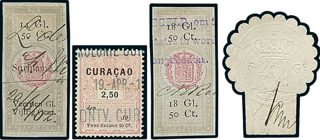 Revenue Stamps The "De Magistris" Collection, Part IINetherlands1637-1952, an interesting collection arranged on album pages comprising over 1,000 stamps used/unused, with forerunners including 1637-1807 embossed paper seals with coat-of-arms, following with Bills of Exchange with embossed round, frying pan and imperforates, Stock Exchange, Municipals, Tobacco labels, Telegraph stamps but used, Colonies with Curaçao, Dutch Indies, Japanese Occupation of Java, Surinam. Photo