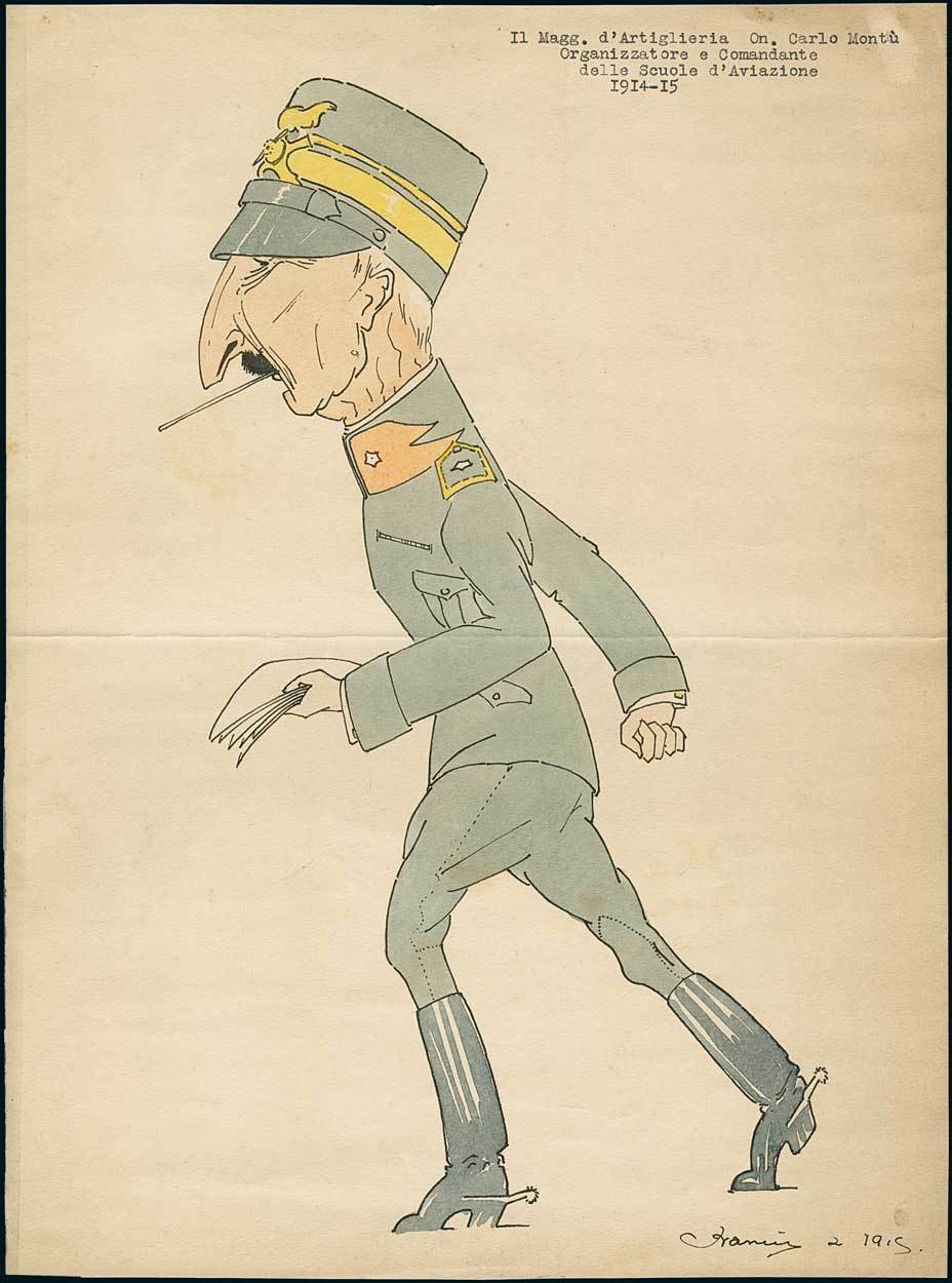 Memorabilia AeronauticaCaricatura a colori in acquerello di Carlo MONTÙ, firmata "Francis 1915": "Il Magg. d'Artiglieria On. Carlo Montù Organizzatore e Comandante delle Scuole d'Aviazione 1914-15". Foto