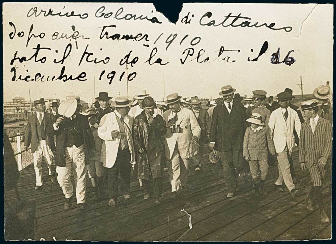 Memorabilia AeronauticaBartolomeo CATTANEO. Primo volo Buenos Aires - Colonia (Uruguay), tre fotografie del 16 dicembre 1910, una con Cattaneo nel suo Blériot mentre stringe la mano di Jorge Newbery, presidente del ''Aero Club Argentino'', manoscritta da Cattaneo al retro; un'altra foto mostra il pilota nel suo aereo, ed una terza, con alcune imperfezioni, mostra Cattaneo a Colonia dopo aver completato il volo. Insieme molto raro. Foto