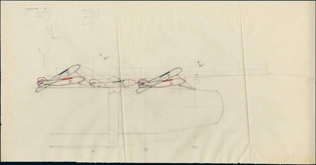 Memorabilia AeronauticaBomba Planante. Interessante serie di disegni tecnici di autore sconosciuto (G.A. CROCCO?) ma datati 1934. Eseguiti a matita su carta lucida ripiegata I disegni e gli schemi, alcuni già con un buon livello di dettaglio, mostrano diverse soluzioni per lo studio di un ordigno munito di ali da collocarsi, presumbilimente, su navi e/o su sommergibili e la cui forma ricorda molto gli attuali cruise missiles. Circa dieci fogli con disegni a matita in b/n ed a colori.