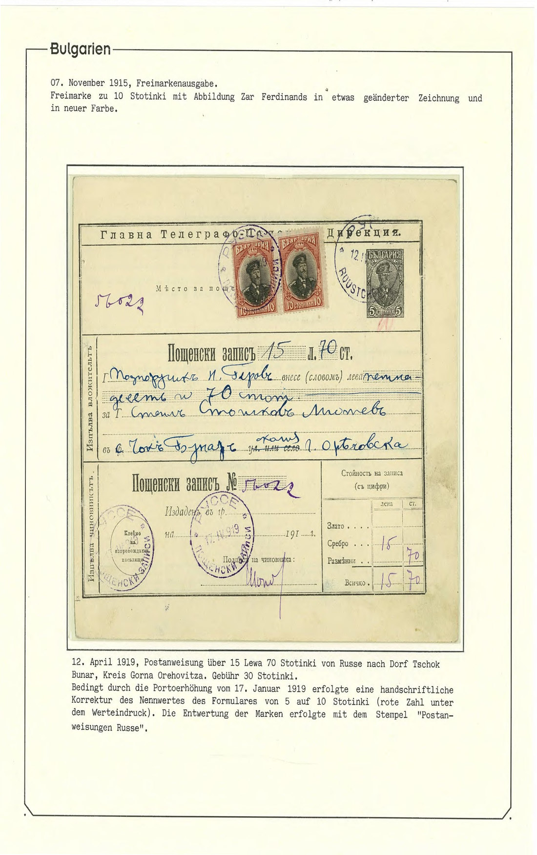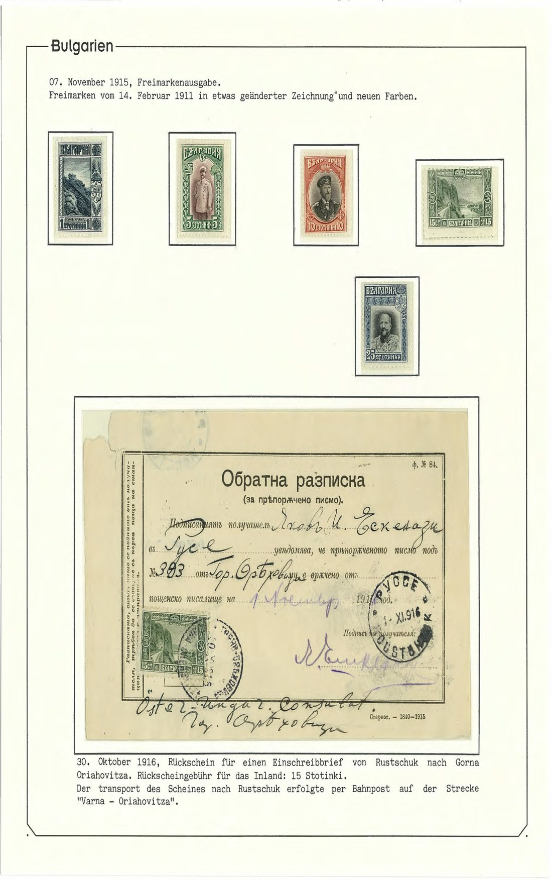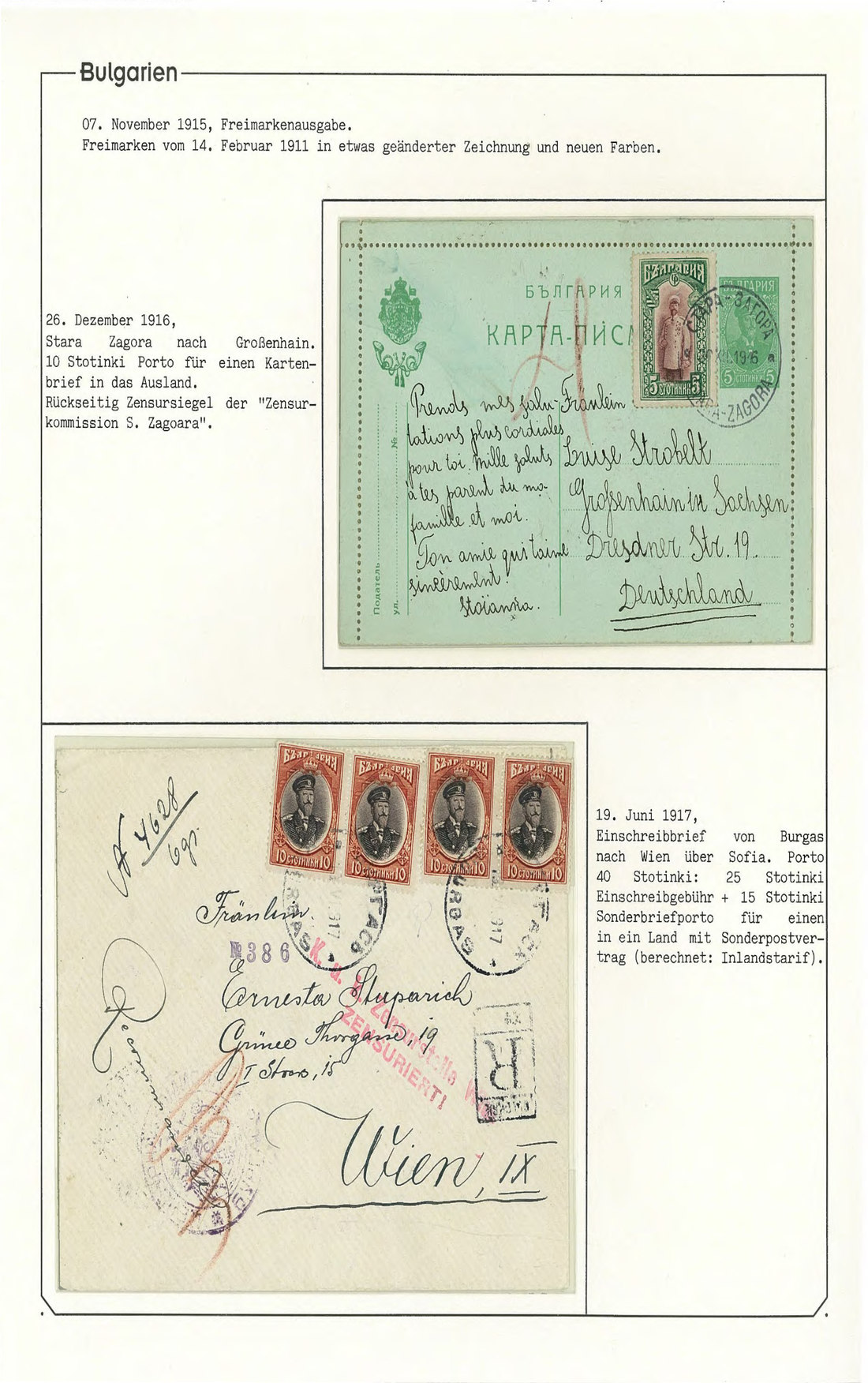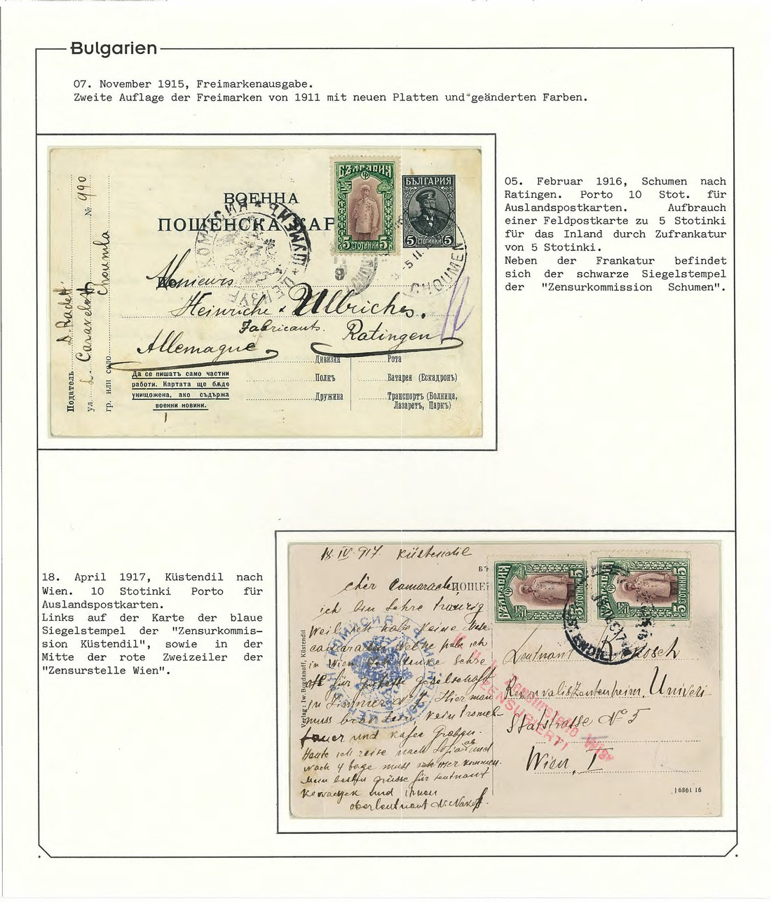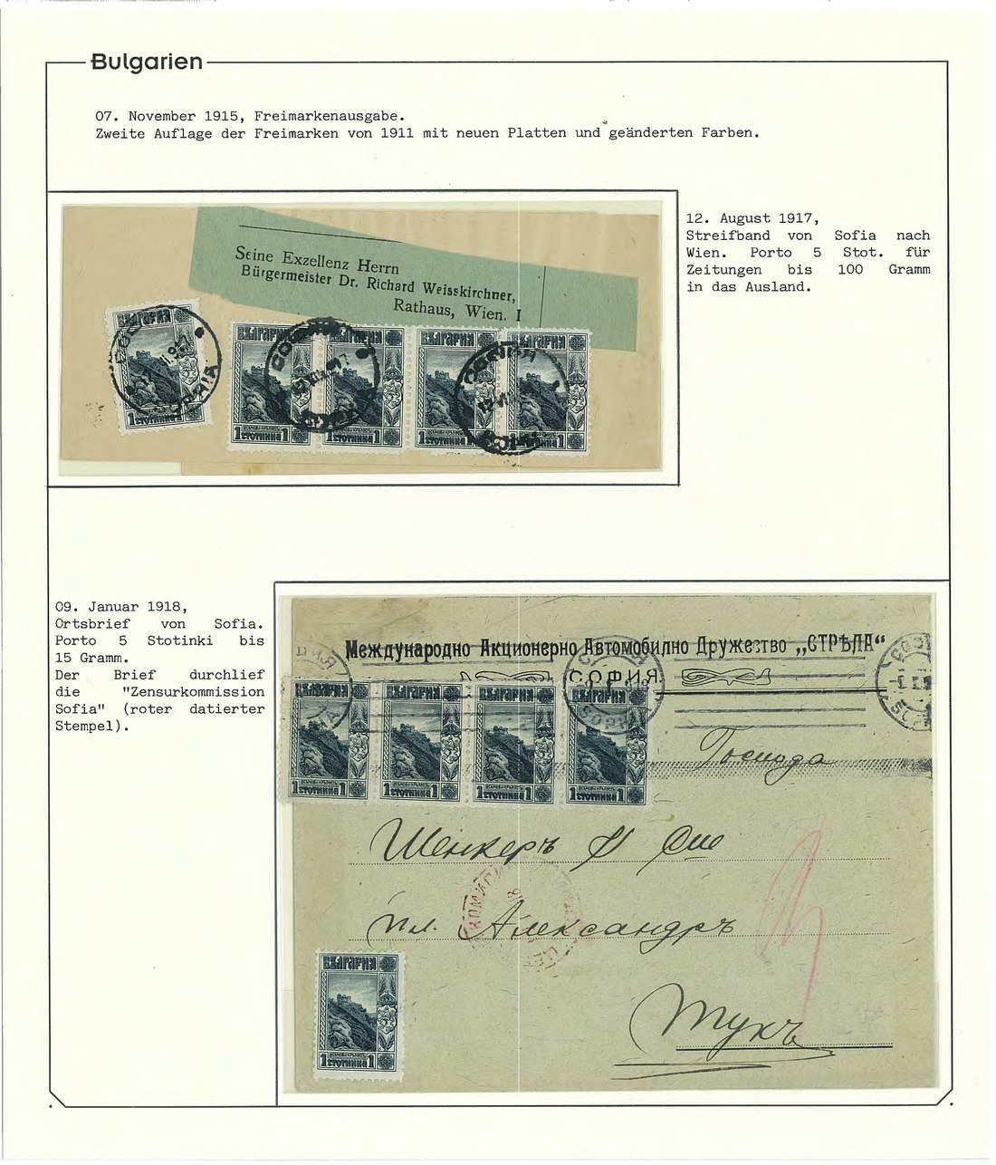 BulgariaLater Issues1915 Pictorial Issue. An interesting collection containing 75 stamps with rare imperforate multiples, and 21 items including a good array of postal documents, with red cross mail, censorships, special rates with bordering countries, etc. Mi. 101-106. Photo