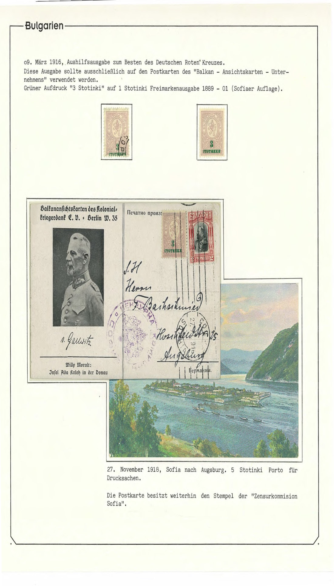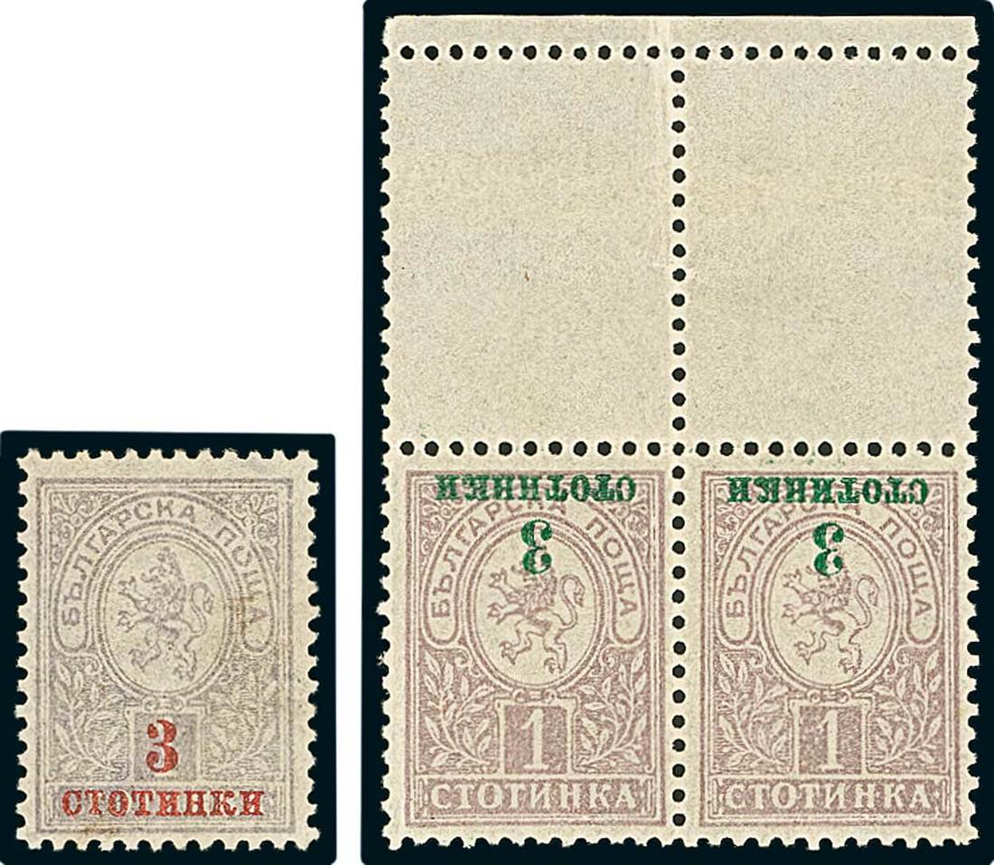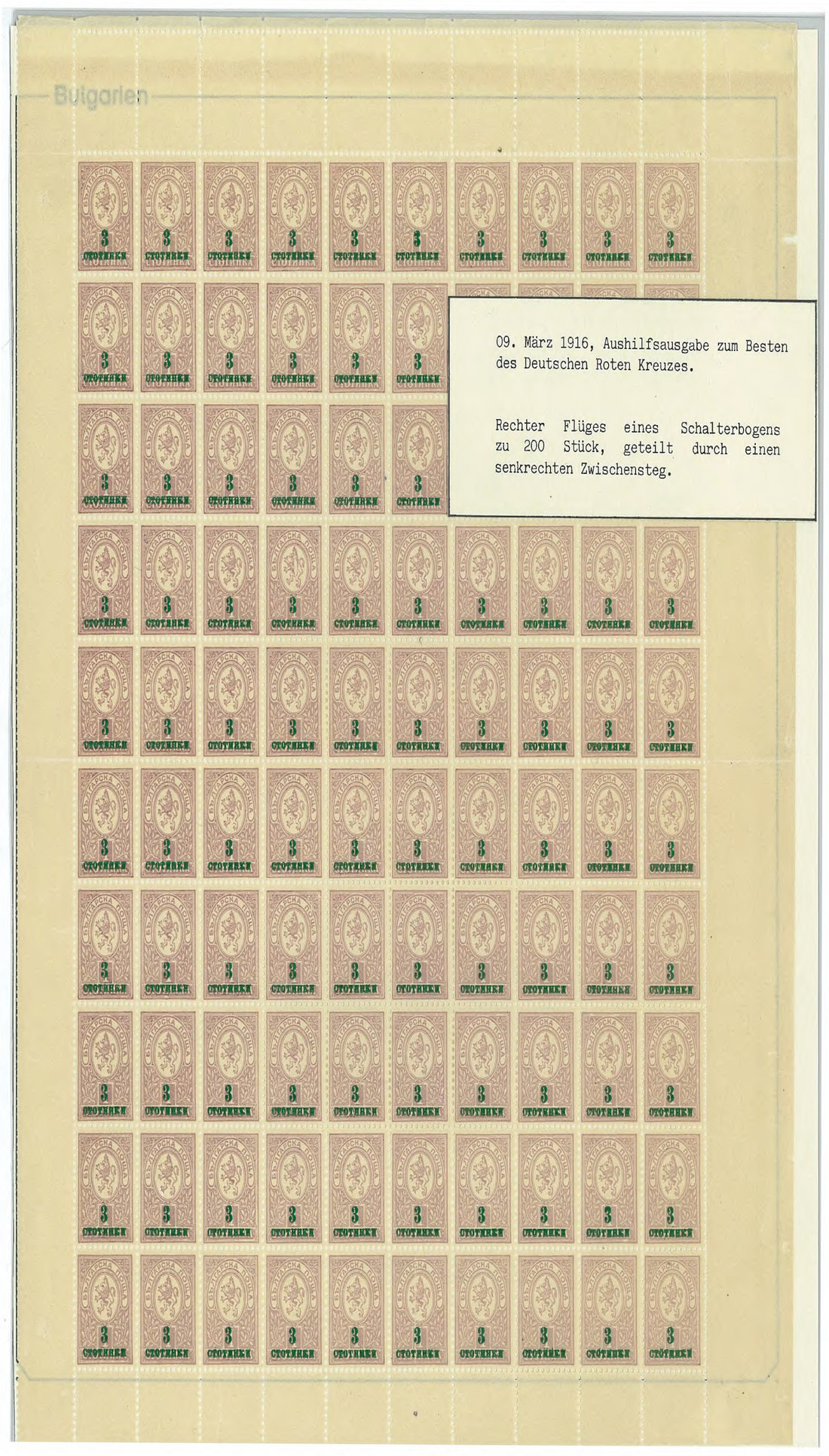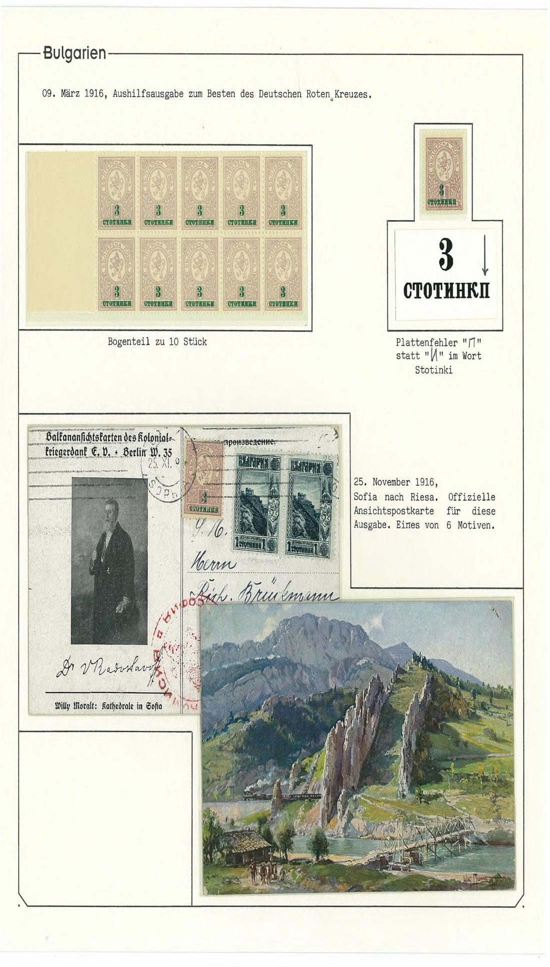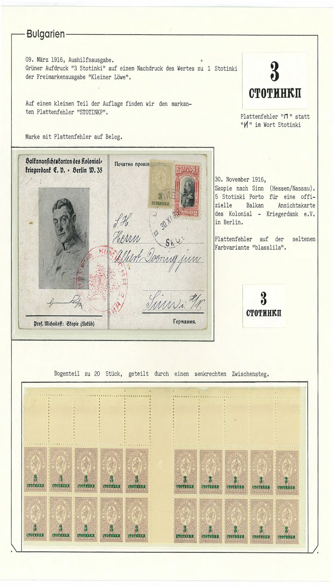 BulgariaLater Issues1916, 3st. on 1st. A comprehensive study with 140 stamps and 7 travelled official postcards of this issue, including the "Stotinkp" instead of "Stotinki" in Cyrillic overprint error, also on postcard (located in position 40 in the sheet, with only 550 stamps printed, the postcard being one of the less than five known); overprint in red on ungummed example (of proof status), inverted overprint on marginal pair, and part sheet of 100. Mi. 107, 107F. Photo
