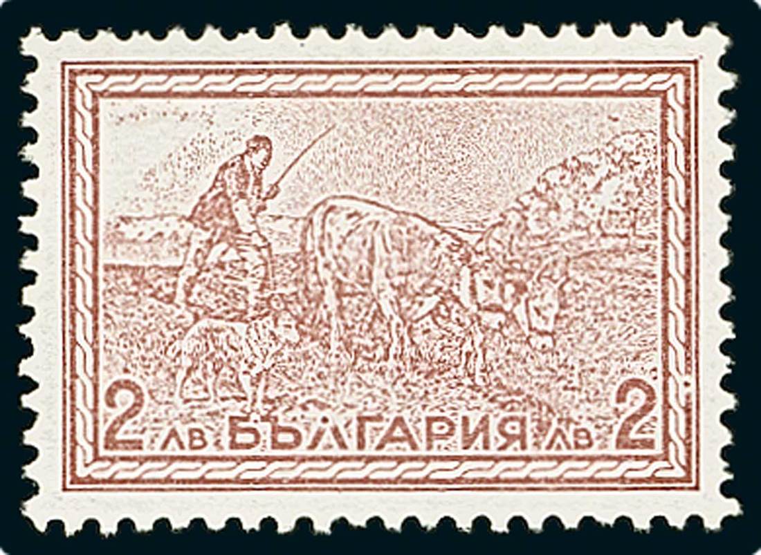 BulgariaLater Issues1917-18, "Plowman", 2l. green, carmine brown and violet-brown, proofs without gum of an unadopted design. Very rare. Cert. Karaivanoff. Photo