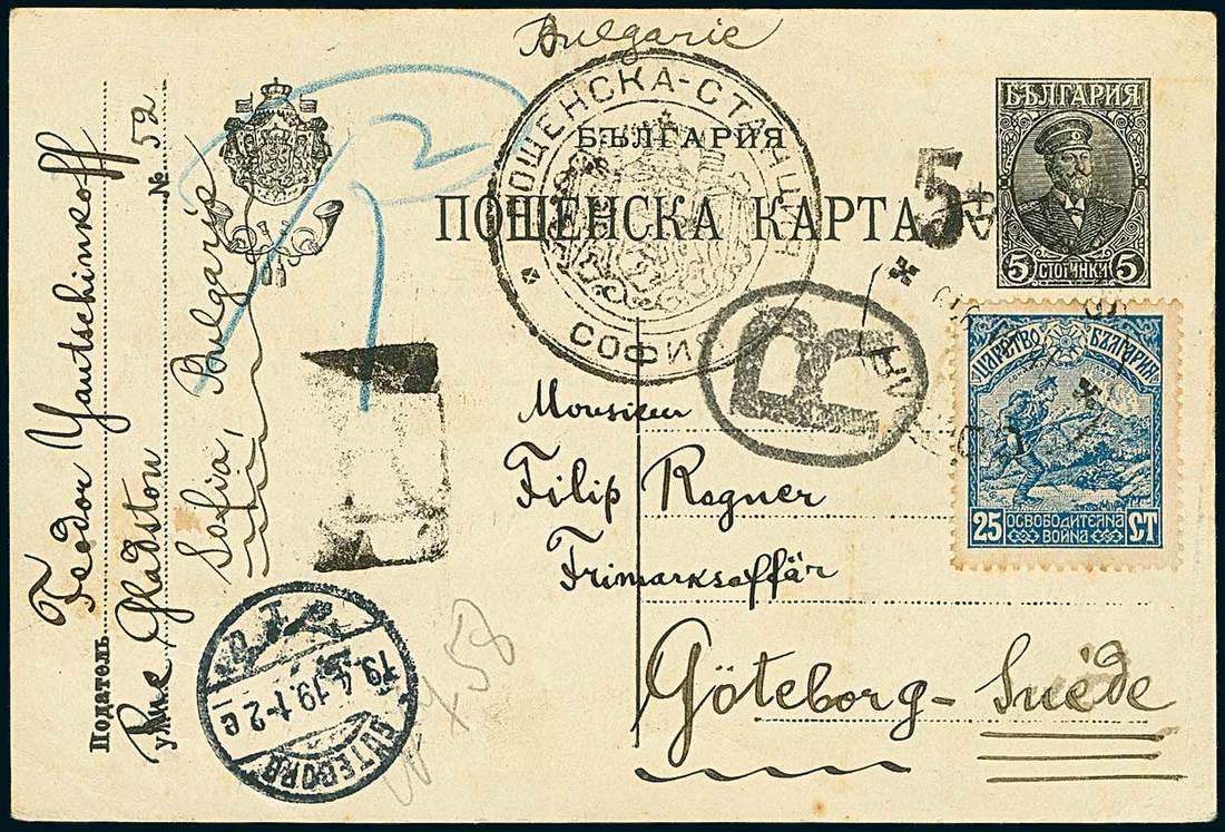 BulgariaLater Issues1919, Provisional "5+" 5st. postal stationery card with matching Cyrillic "Postal Station/Sofia" cachet with coat-of-arms in centre, sent to Göteborg (Sweden) and upfranked1917-19 25st., tied by Sofia c.d.s. on dispatch, and arrival alongside. As a result of the increase in the rate for inland postcards, from 5 to 10 stotinki, and due to the scarcity of available 5st. denominations, in March 1919 3,000 postcards were provisionally "5+" surcharged with a postal cachet for validation in centre, in order to avoid fraudulent usages. One of only about five items known. Cert. Hitzler. Photo