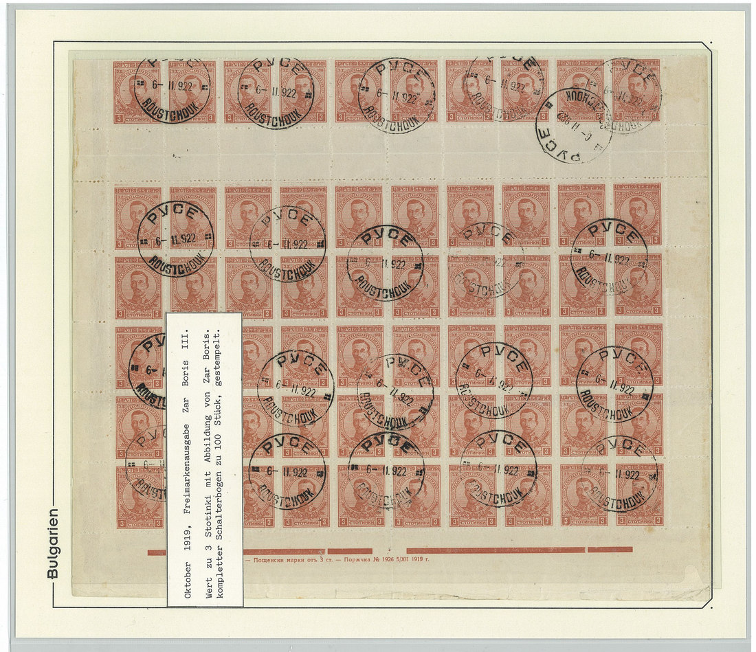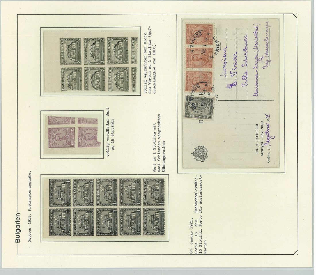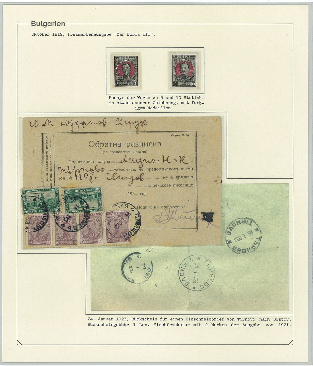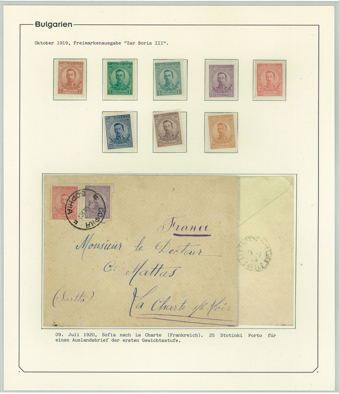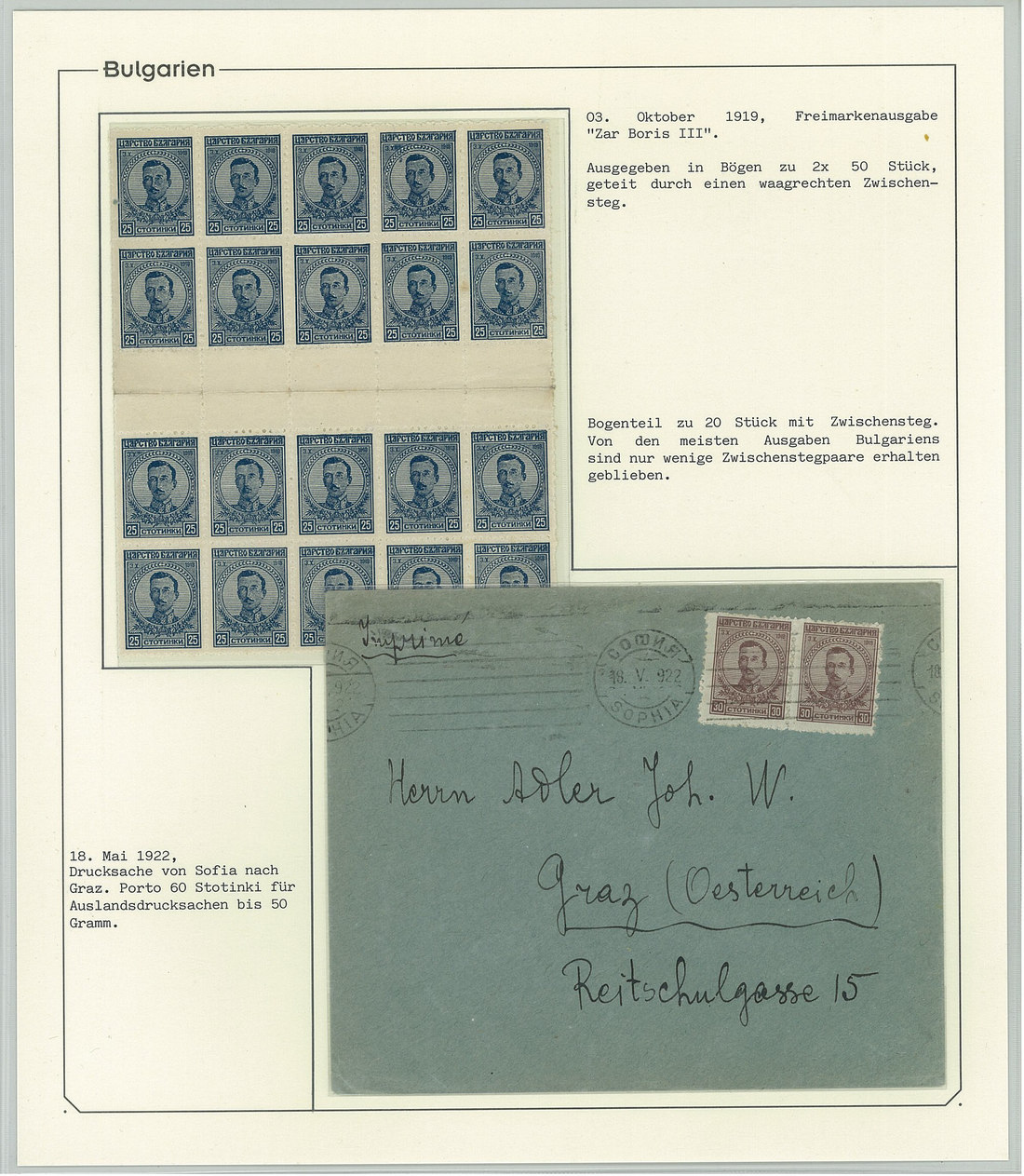 BulgariaLater Issues1919-20, Tsar Boris III. A comprehensive collection mounted on exhibition pages, comprising over 800 stamps including complete sheets, abundant varieties incl. the rare fiscal stamps paper, proofs and imperforates; and 35 items in a good array of postal documents, being mainly covers sent abroad. Viewing essential. Mi. 126-134. Photo