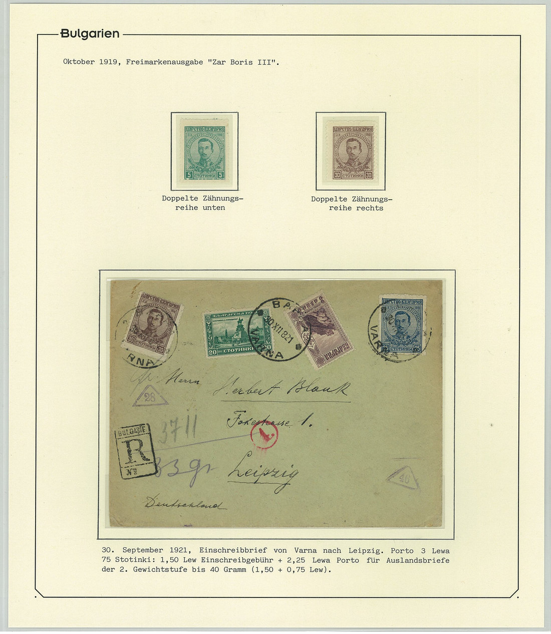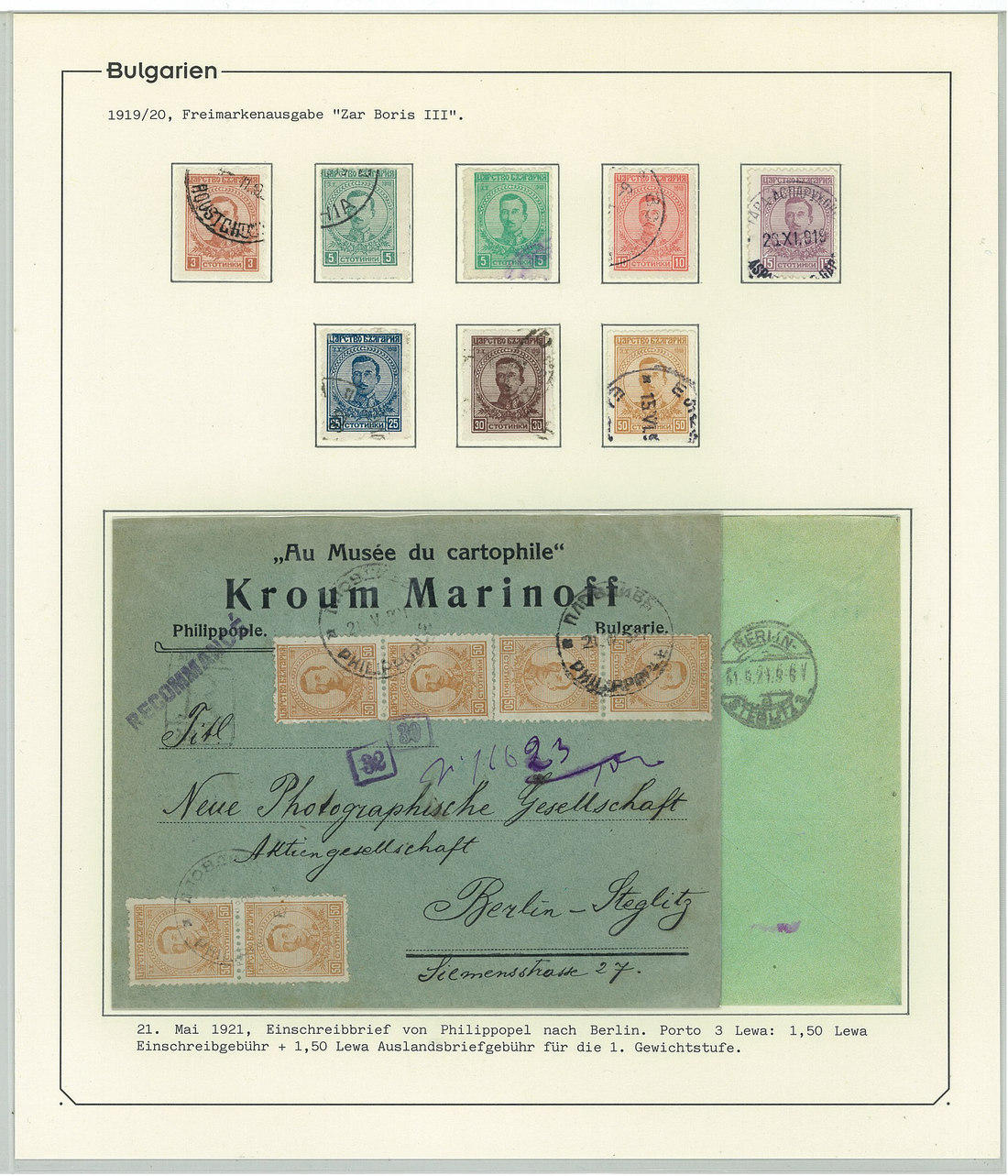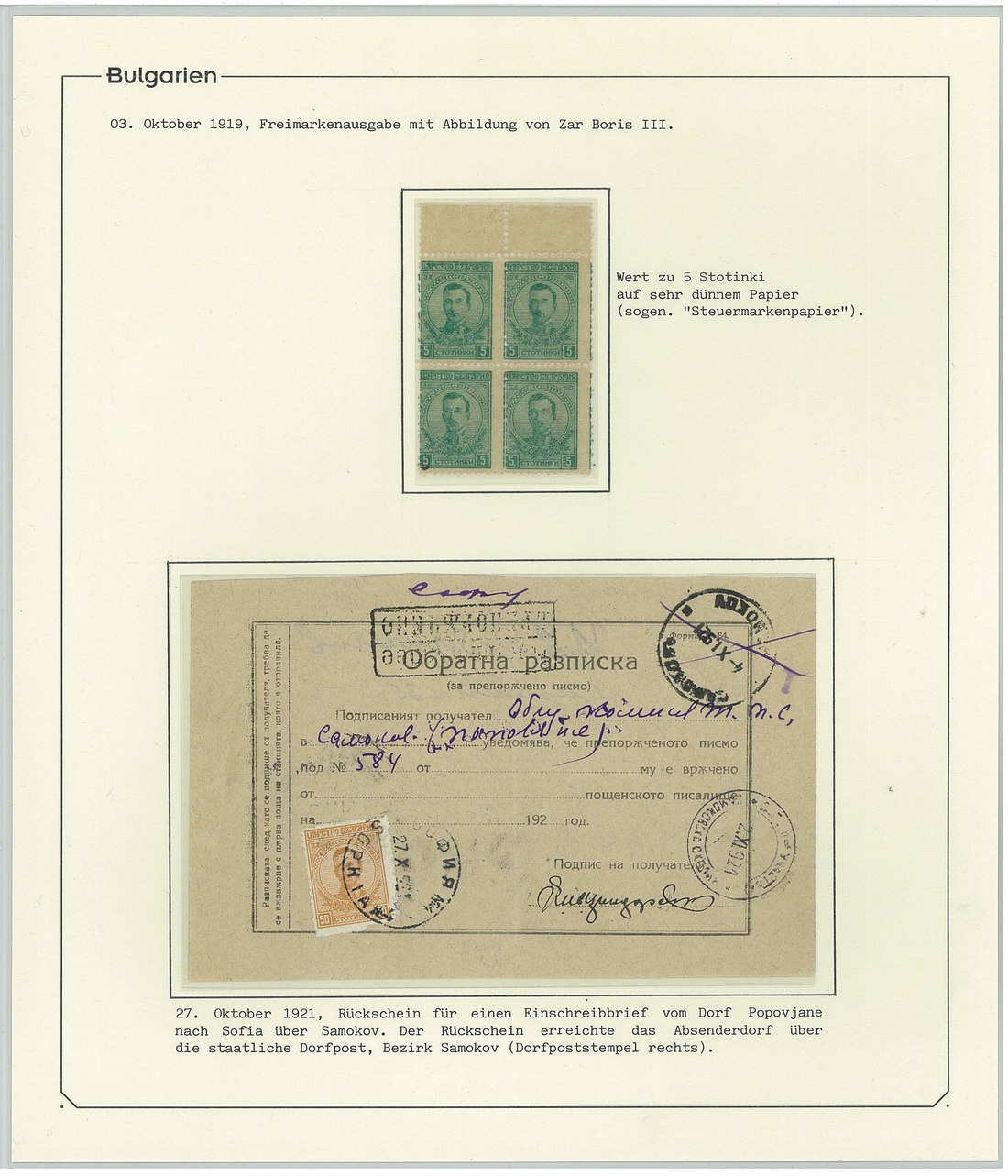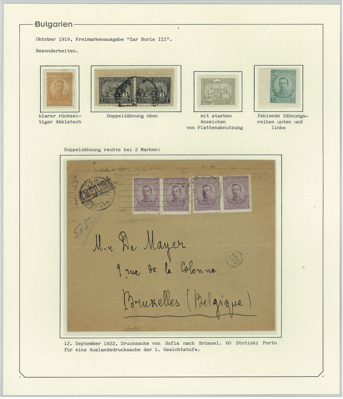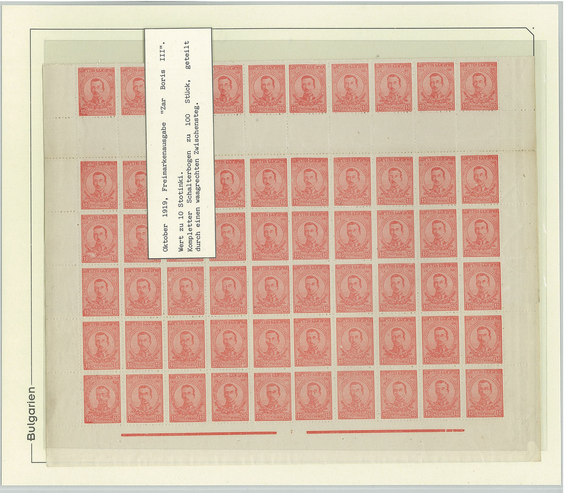 BulgariaLater Issues1919-20, Tsar Boris III. A comprehensive collection mounted on exhibition pages, comprising over 800 stamps including complete sheets, abundant varieties incl. the rare fiscal stamps paper, proofs and imperforates; and 35 items in a good array of postal documents, being mainly covers sent abroad. Viewing essential. Mi. 126-134. Photo