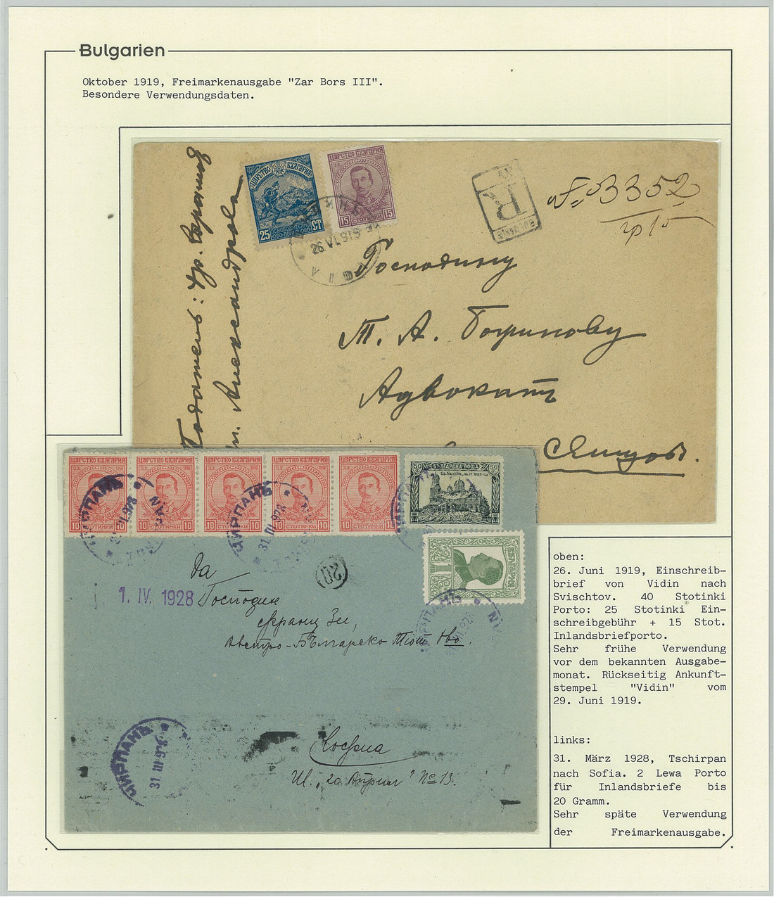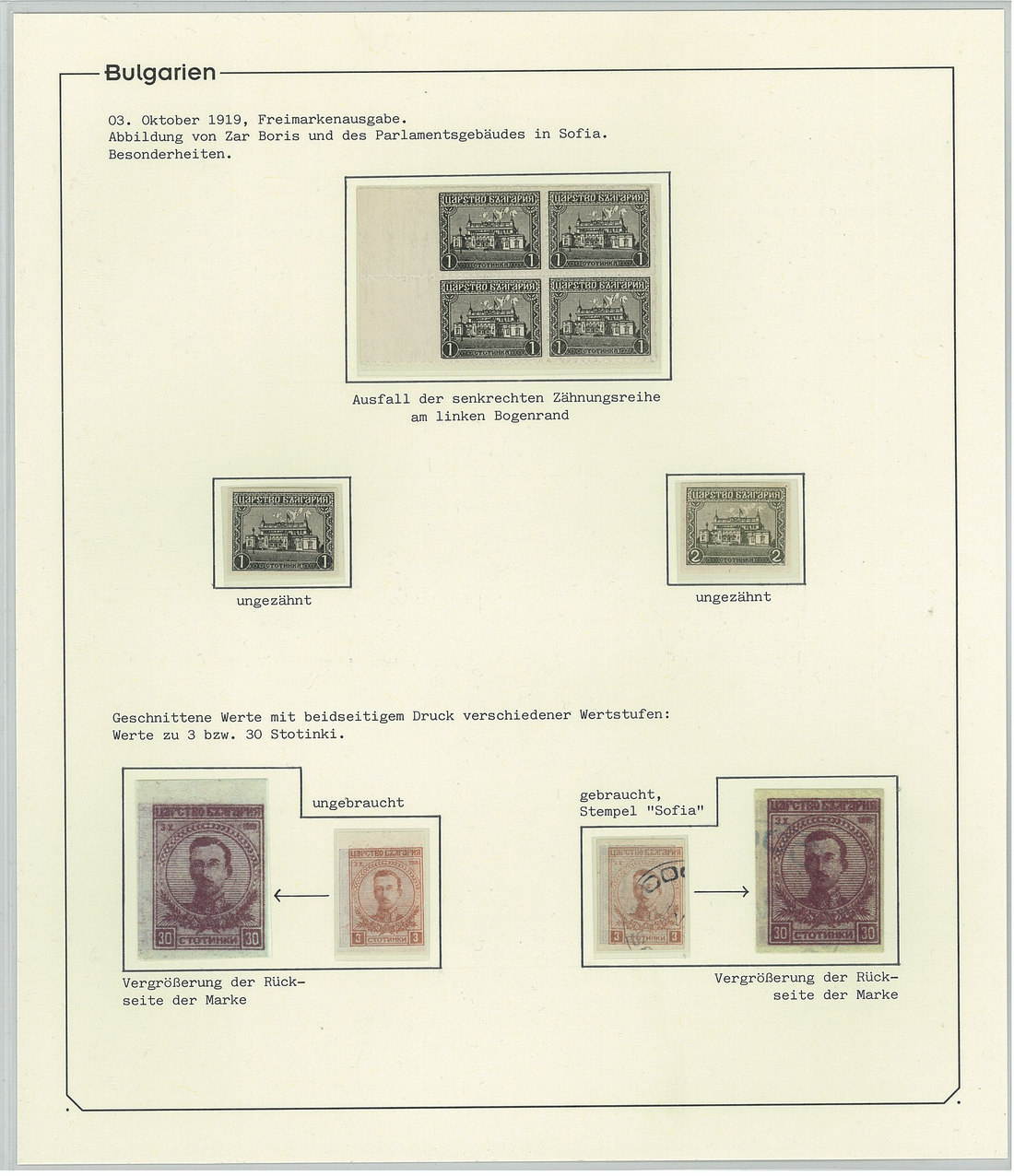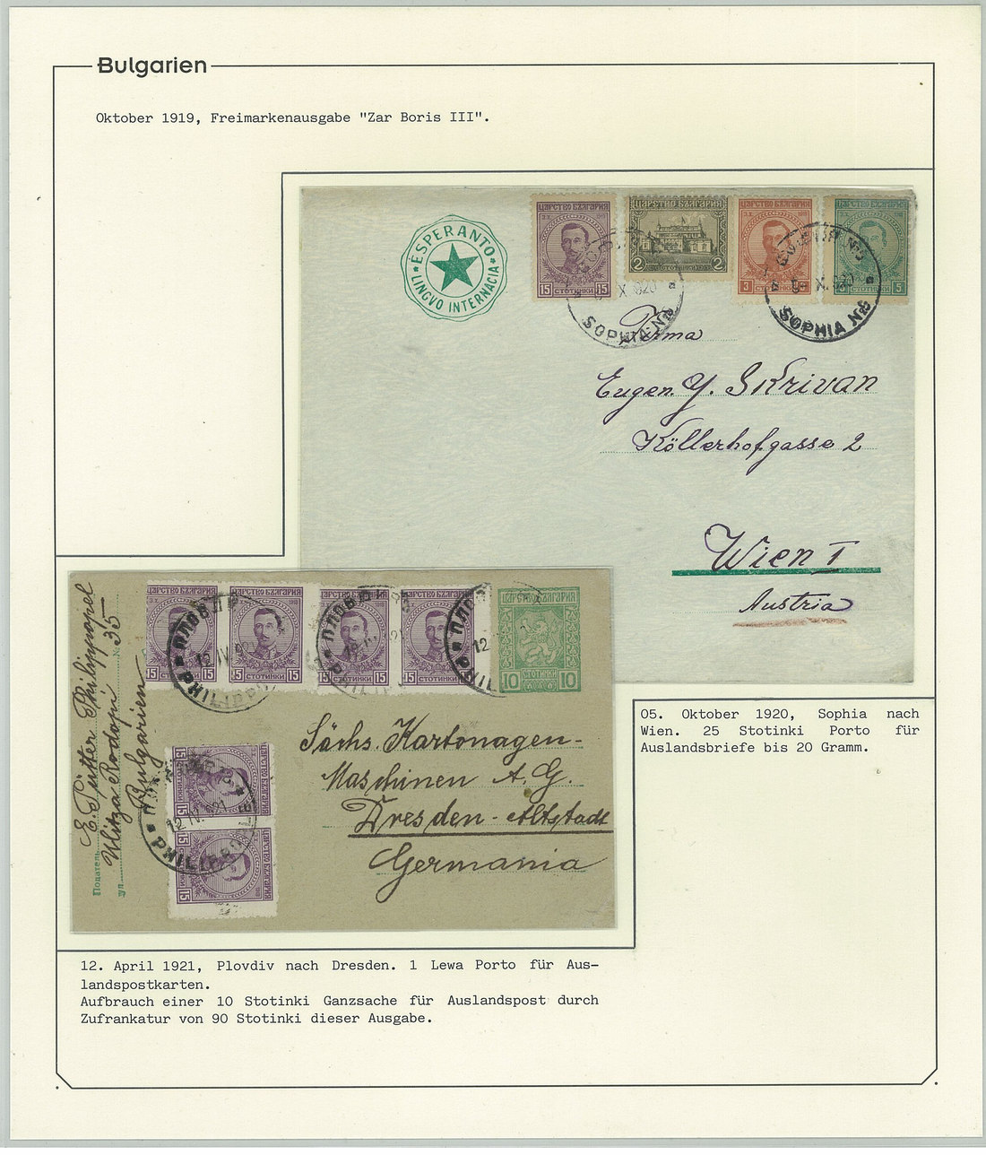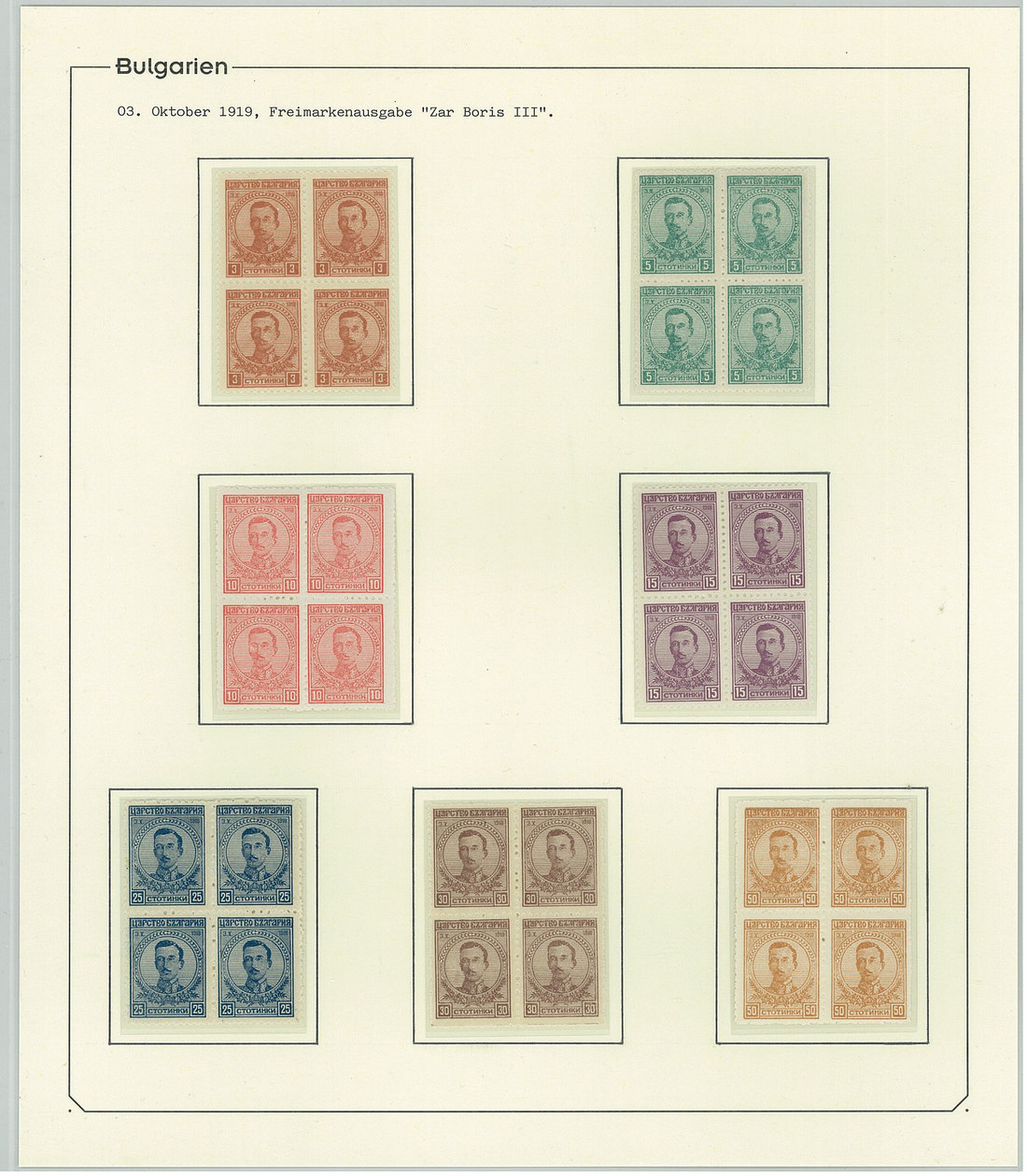 BulgariaLater Issues1919-20, Tsar Boris III. A comprehensive collection mounted on exhibition pages, comprising over 800 stamps including complete sheets, abundant varieties incl. the rare fiscal stamps paper, proofs and imperforates; and 35 items in a good array of postal documents, being mainly covers sent abroad. Viewing essential. Mi. 126-134. Photo